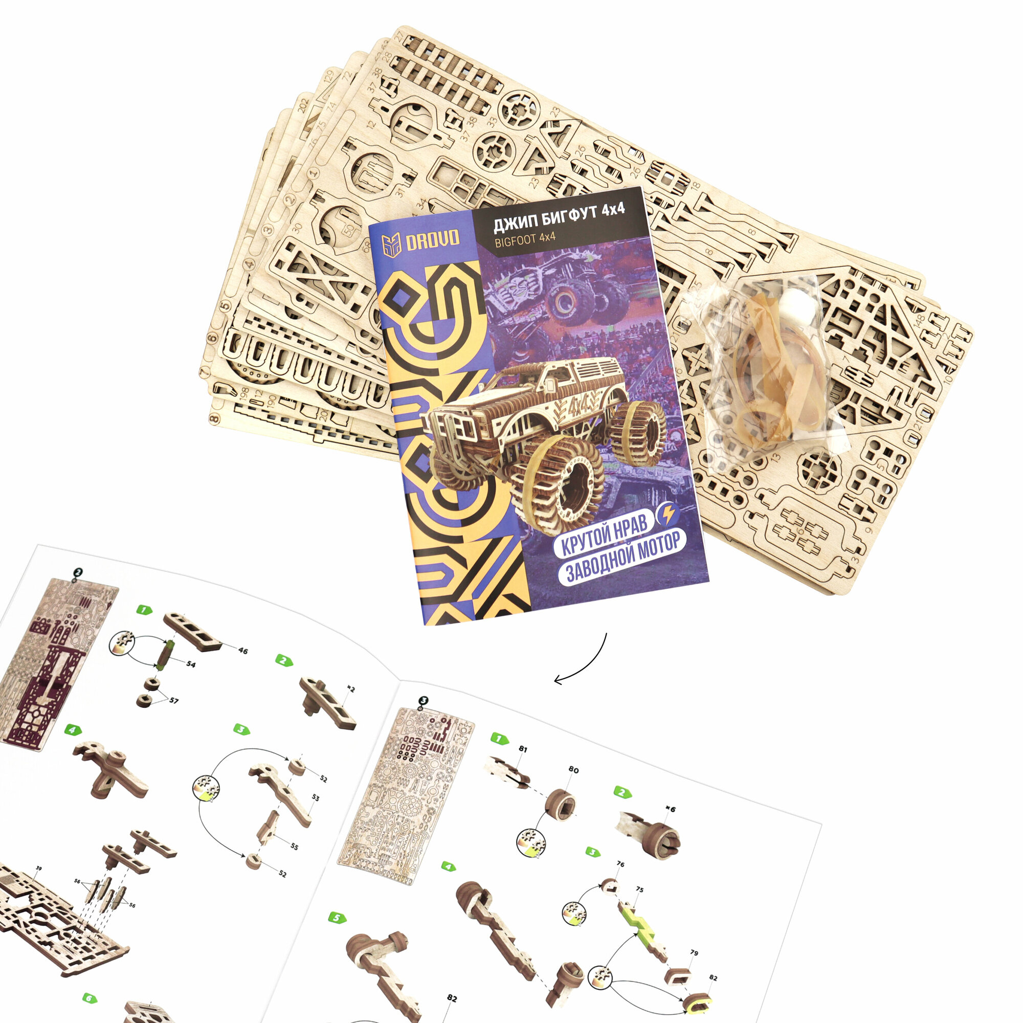Деревянный конструктор Джип БигФут 4x4 станет отличным подарком для детей и взрослых, любителей больших автомобилей и внедорожников на полном приводе. Такой конструктор подойдет не только для мальчиков, но и для настоящих мужчин. Сборная модель из дерева представляет собой вездеходных джип с большой детализацией и амортизирующей подвеской. С деревянным 3D пазлом с заводным механизмом можно участвовать в соревнованиях по дальности и скорости. В отличии от резинового механизма, наша металлическая спиральная пружина в моторе не высыхает, не растягивается и служит дольше.А, чтобы играть с детьми было еще веселее вы можете раскрасить модель в любимые цвета. Аккуратно вырезанные детали фанерной модели DROVO без заусенцев обеспечивают гладкий материал и безопасное использование игрушки.Сборная модель из дерева легко собирается и хорошо сочетается с любым интерьером и может стать интересным элементом украшения офиса или дома, а также частью сюжетной игры.Моделирование из фанеры – это процесс, который доставля