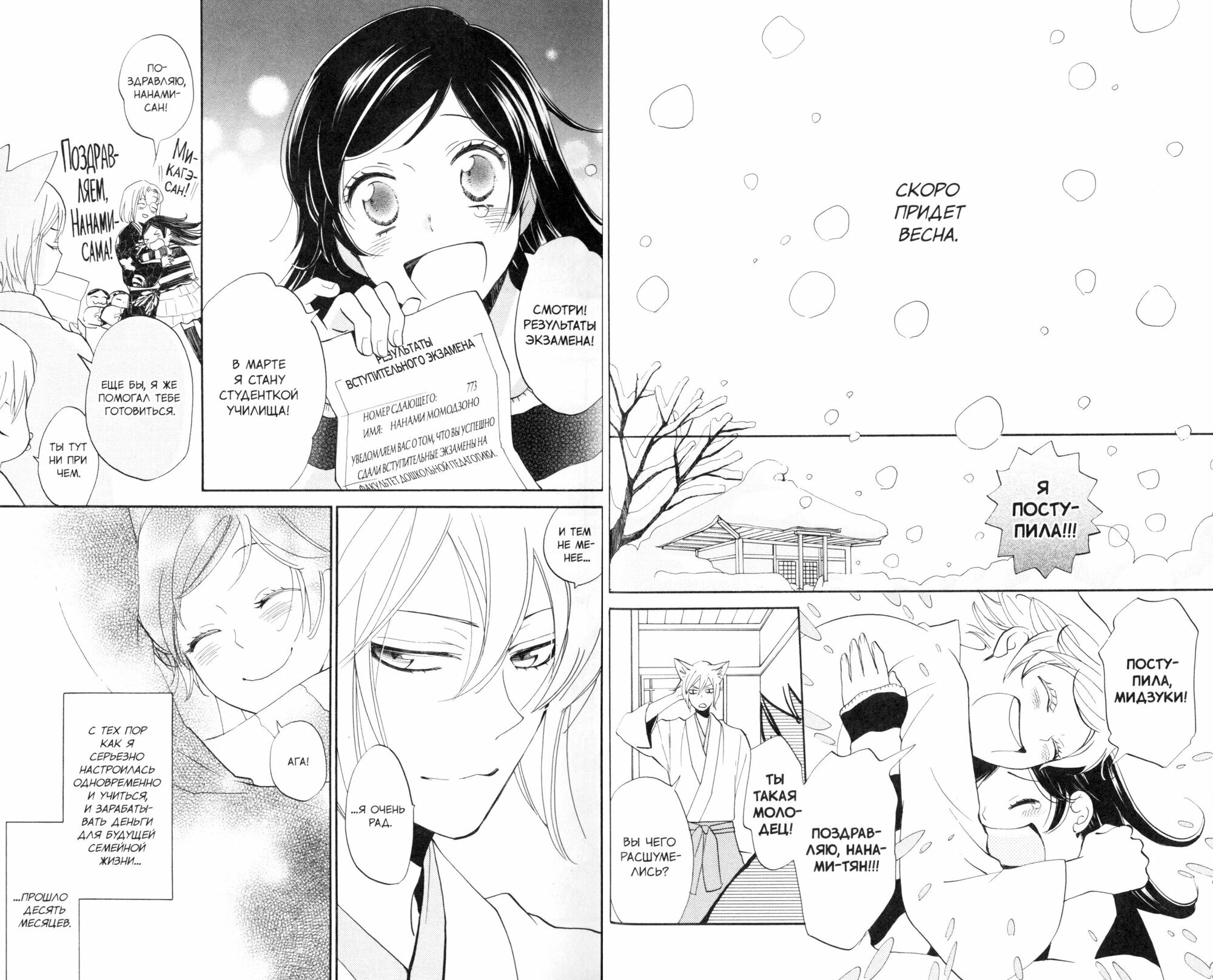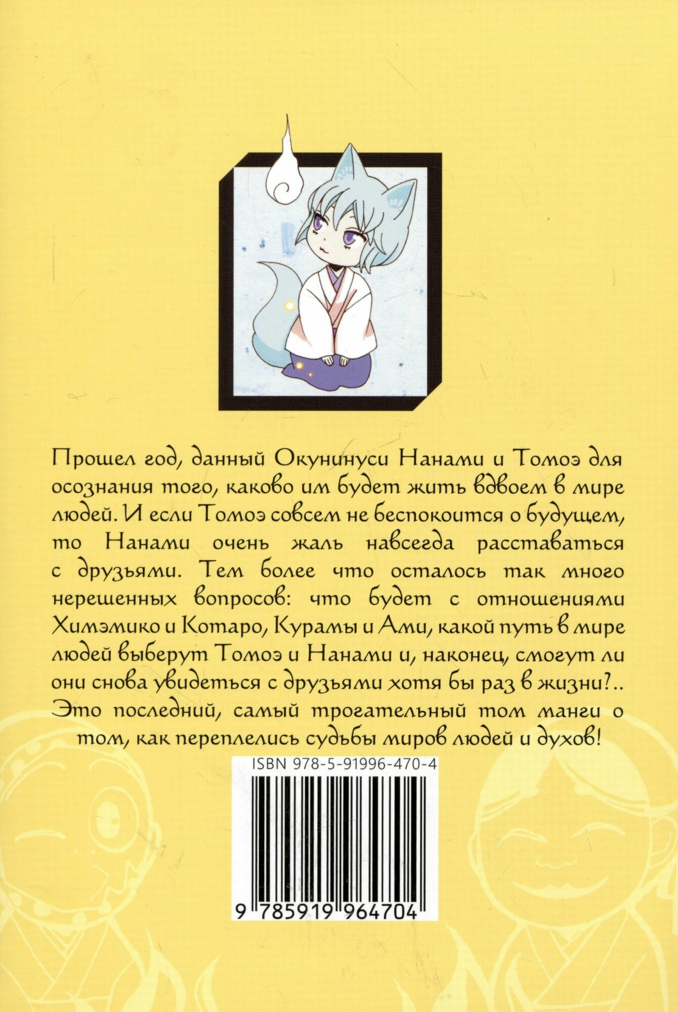 Прошел год, данный Окунинуси Нанами и Томоэ для осознания того, каково им будет жить вдвоем в мире людей. И если Томоэ совсем не беспокоится о будущем, то Нанами очень жаль навсегда расставаться с друзьями. Тем более что осталось так много нерешенных вопросов: что будет с отношениями Химэмико и Котаро, Курамы и Ами, какой путь в мире людей выберут Томоэ и Нанами и, наконец, смогут ли они снова увидеться с друзьями хотя бы раз в жизни?.. Это последний, самый трогательный том манги о том, как переплелись судьбы миров людей и духов!