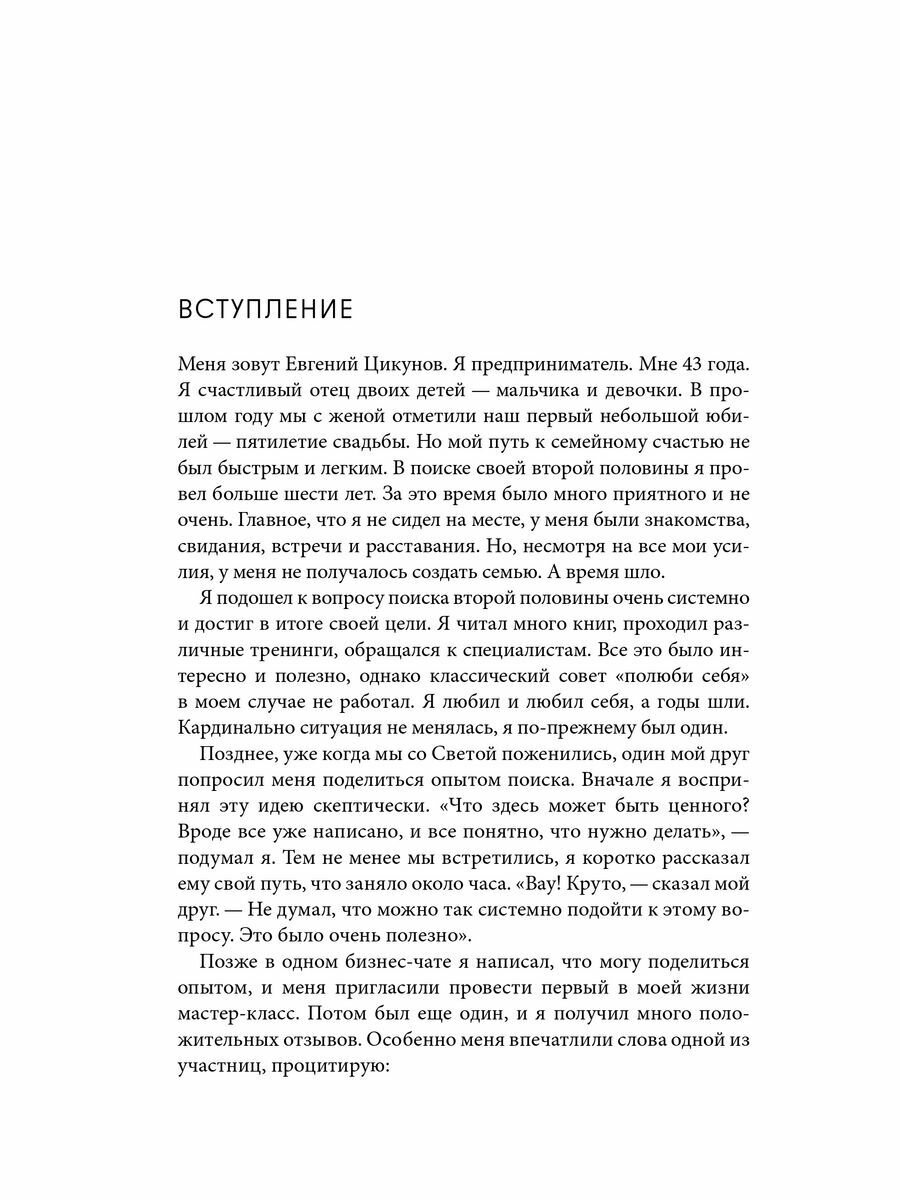 Евгений Цикунов — предприниматель. Поэтому и к поиску второй половины он подошел как к проекту: поставил цель, очертил рамки и приступил к тестированию гипотез. Поиски продолжались три года, и за это время Евгений попробовал самые разные способы знакомства — от общения на тематических сайтах до подбрасывания визиток в окно машины понравившейся девушки. Проект оказался удачным: сегодня он муж и отец двоих детей. В этой книге автор делится своим опытом и советами по поиску второй половинки, которые помогут каждому, кто действительно хочет обрести любовь.