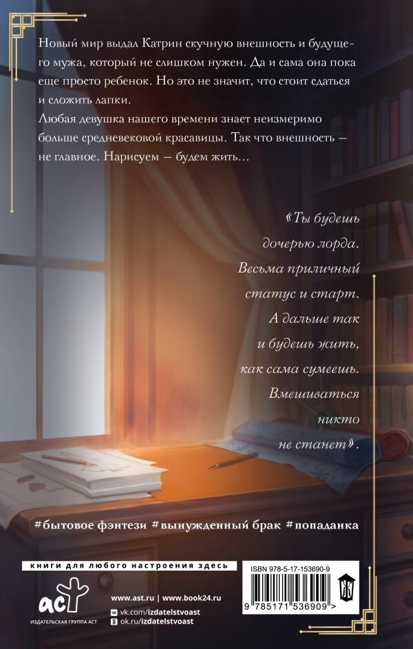 Новый мир выдал Катрин скучную внешность и будущего мужа, который не слишком нужен. Да и сама она пока еще просто ребенок. Но это не значит, что стоит сдаться и сложить лапки. Любая девушка нашего времени знает неизмеримо больше средневековой красавицы. Так что внешность — не главное. Нарисуем — будем жить...