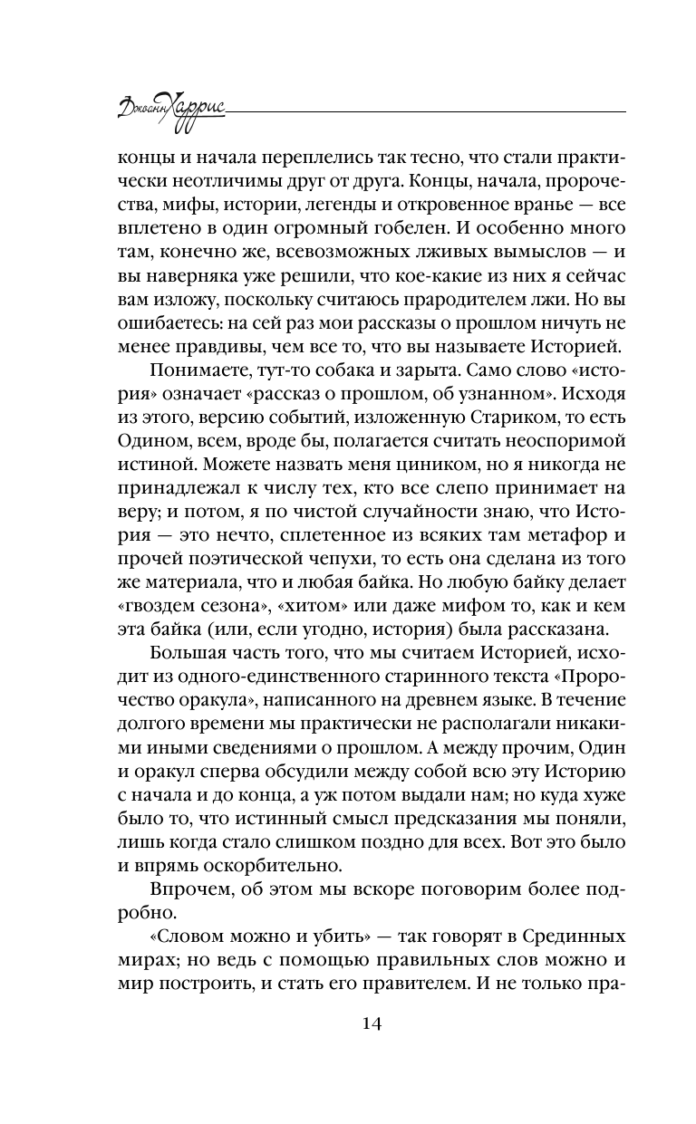 Автор бестселлеров "Шоколад", "Ежевичное вино" и многих других создала удивительный роман о скандинавских богах, человеческих слабостях и приключениях. О похождениях самого знаменитого плута и задиры Джоанн Харрис написала от первого лица – и добилась удивительного эффекта достоверности, так что невозможно не проникнуться сочувствием к ее герою. Локи никогда не отличался скромным нравом и дружелюбным характером. Да и с чего бы это, ведь он бог хитрости и обмана! Но даже богам, пусть и великим обманщикам, не уйти от судьбы. Локи поведает историю своего путешествия в глубины Хаоса, расскажет о многочисленных подвигах, совершенных ради одноглазого Одина, падении небесного города Асгарда и, конечно же, о предательстве, которое ему так знакомо!