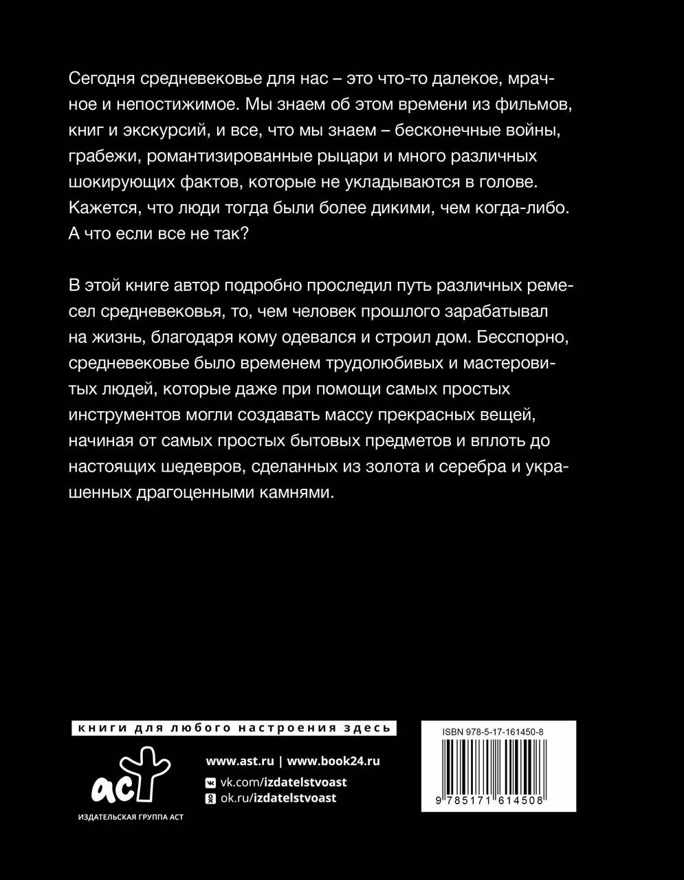 Сегодня средневековье для нас – это что-то далекое, мрачное и непостижимое. Мы знаем об этом времени из фильмов, книг и экскурсий, и все, что мы знаем – бесконечные войны, грабежи, романтизированные рыцари и много различных шокирующих фактов, которые не укладываются в голове. Кажется, что люди тогда были более дикими, чем когда-либо. А что если все не так? В этой книге автор подробно проследил путь различных ремесел средневековья, то, чем человек прошлого зарабатывал на жизнь, благодаря кому одевался и строил дом. Бесспорно, средневековье было временем трудолюбивых и мастеровитых людей, которые даже при помощи самых простых инструментов могли создавать массу прекрасных вещей, начиная от самых простых бытовых предметов и вплоть до настоящих шедевров, сделанных из золота и серебра и украшенных драгоценными камнями.