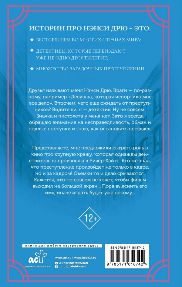 Друзья называют меня Нэнси Дрю. Враги — по-разному, например: «Девушка, которая испортила мне все дело». Впрочем, чего еще ожидать от преступников? Видите ли, я — детектив. Ну не совсем. Значка и пистолета у меня нет. Зато я всегда обращаю внимание на несправедливость, обман и подлые поступки и знаю, как остановить негодяев. Представляете, мне предложили сыграть роль в кино про крупную кражу, которая однажды действительно произошла в Ривер-Хайтс. Кто знал, что преступление произойдет не только в кадре, но и за кадром! Съемки то и дело срываются. Кажется, кто-то совсем не хочет, чтобы фильм выходил на большой экран... Пора выяснить его имя, иначе играть будет уже некому...