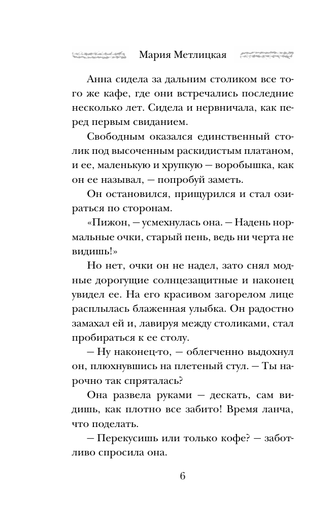 Так бывает: видишь совершенно незнакомых людей и немедленно сочиняешь их историю. Пожилой, импозантный господин и немолодая женщина сидят за столиком ресторана в дорогом спа-отеле с видом на Карпатские горы. При виде этой пары очень хочется немедленно додумать, кто они. Супруги со стажем? Бывшие любовники? Марек и Анна встречаются раз в год — она приезжает из Кракова, он прилетает из Израиля. Им есть что рассказать друг другу, а главное — о чем помолчать. Потому что когда-то они действительно были супругами и любовниками. В книгах истории нередко заканчиваются у алтаря. В жизни у алтаря история только начинается. История этих двоих не похожа ни на какую другую. Это история надежды, отчаяния и — бесконечной любви.
