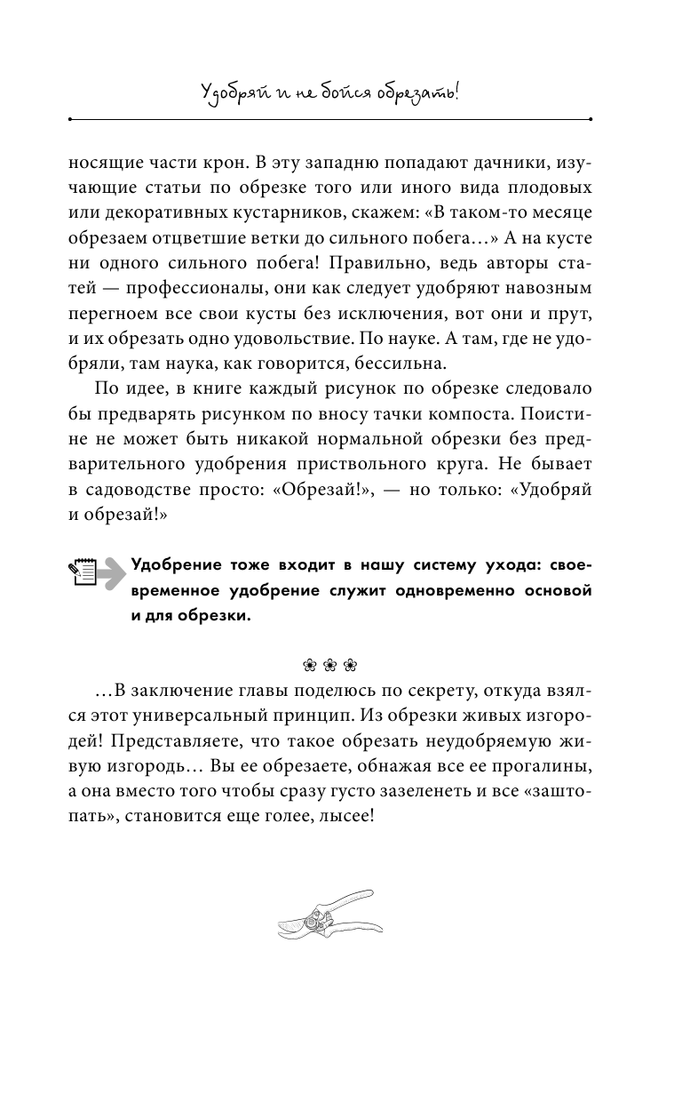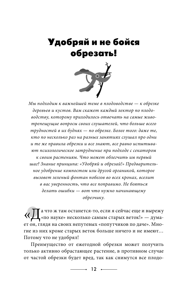 Эта книга написана садоводом-практиком, который экспериментирует с органическими удобрениями более 40 лет. Автор давно отказался от применения минеральных удобрений и трепетно следит за химическим составом почвы. Но все садоводы знают: без удобрений, подкормок и обрезки в саду не обойтись. Как правильно провести обрезку, чтобы не навредить растениям, а, наоборот, повысить урожайность, отодвинуть процесс старения деревьев, привести в порядок форму кроны? В книге вы найдете принципы здорового садоводства без ошибок и без нервов, основные секреты сверхурожая в саду, правила обрезки, подкормки, поливов и ухода за плодово-ягодным садом.