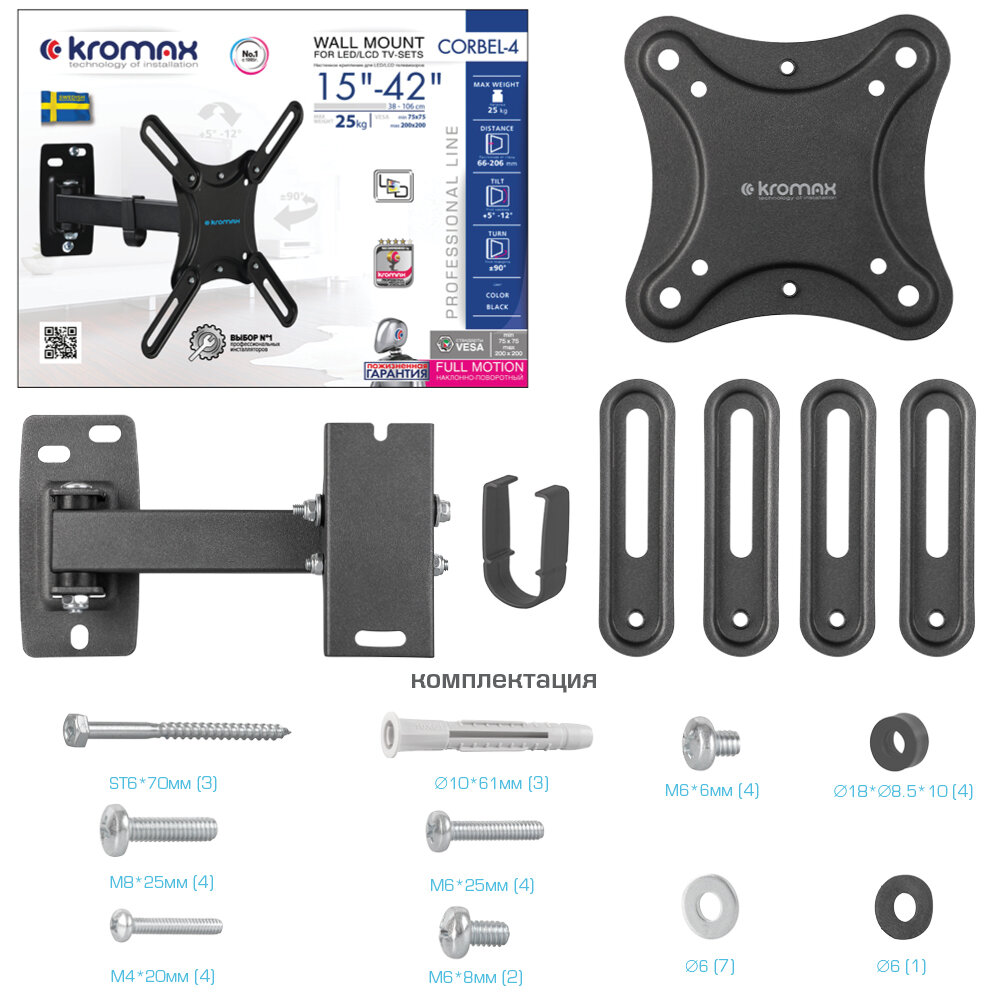 KROMAX BLACK надёжно удержит экран размером 15"-42" дюйма и весом 25 кг. Простая конструкция KROMAX BLACK идеально подойдет для самостоятельного монтажа. Наклонно-поворотная регулировка позволит наклонять вверх и вниз на +5°-12°, поворачивать влево и вправо на ±90°, и выдвигать на 66-206 мм.Кронштейн подходит для большинства телевизоров популярных брендов.Крепёжные отверстия KROMAX BLACK изготовлены по стандарту VESA.В комплектацию KROMAX BLACK входят необходимые для монтажа материалы. Вся продукция обеспечивается гарантийными обязательствами. Пожизненная гарантия на все сварные и механические соединения позволит наслаждаться конструкцией долгий срок. Во время эксплуатации KROMAX BLACK демонстрирует поразительную износостойкость и безотказность.