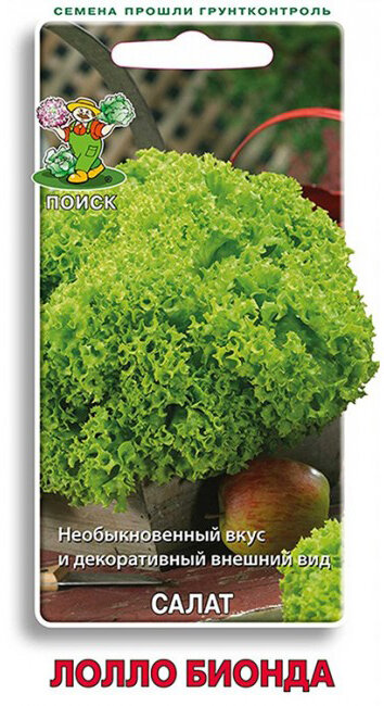**Салат «Лолло Бионда»** — среднеспелый сорт кочанного типа. Идеален для свежих салатов. До срезки с момента всходов семян — 50 дней. Розетка приподнята над землей, диаметр — до 25 см. Листья средние по размеру, сочные, хрустящие, ярко-зеленого цвета, волнистые по краю. Вес растения — до 150 г, высота — до 24 см. Семена высевают в мае, сбор урожая в июне — июле.