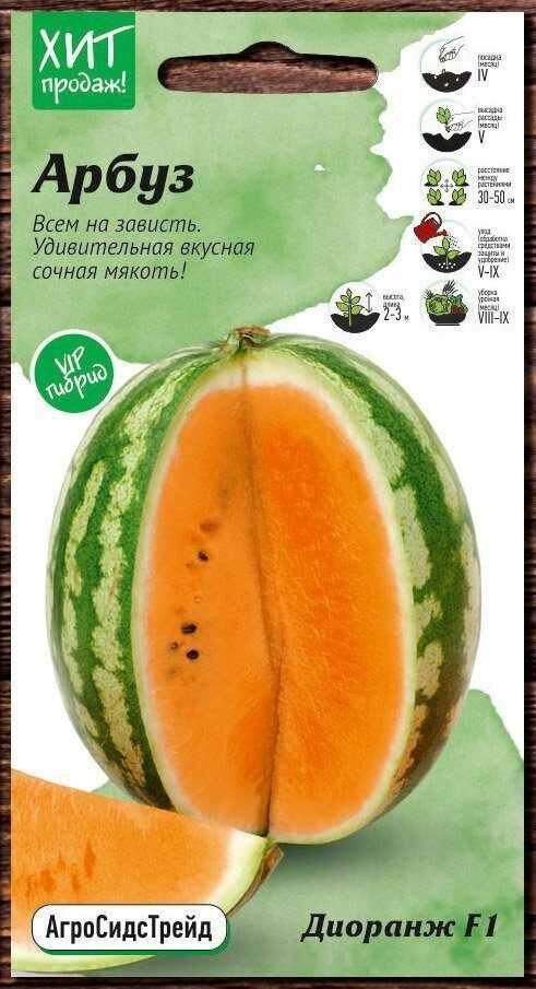 **Арбуз Диоранж F1** — среднеспелый гибрид. Плод массой 7-9 кг с сочной оранжевой сладкой мякотью (содержание сахаров 12,0-13,0% по шкале Брикс). Длина растения 2-3 м.