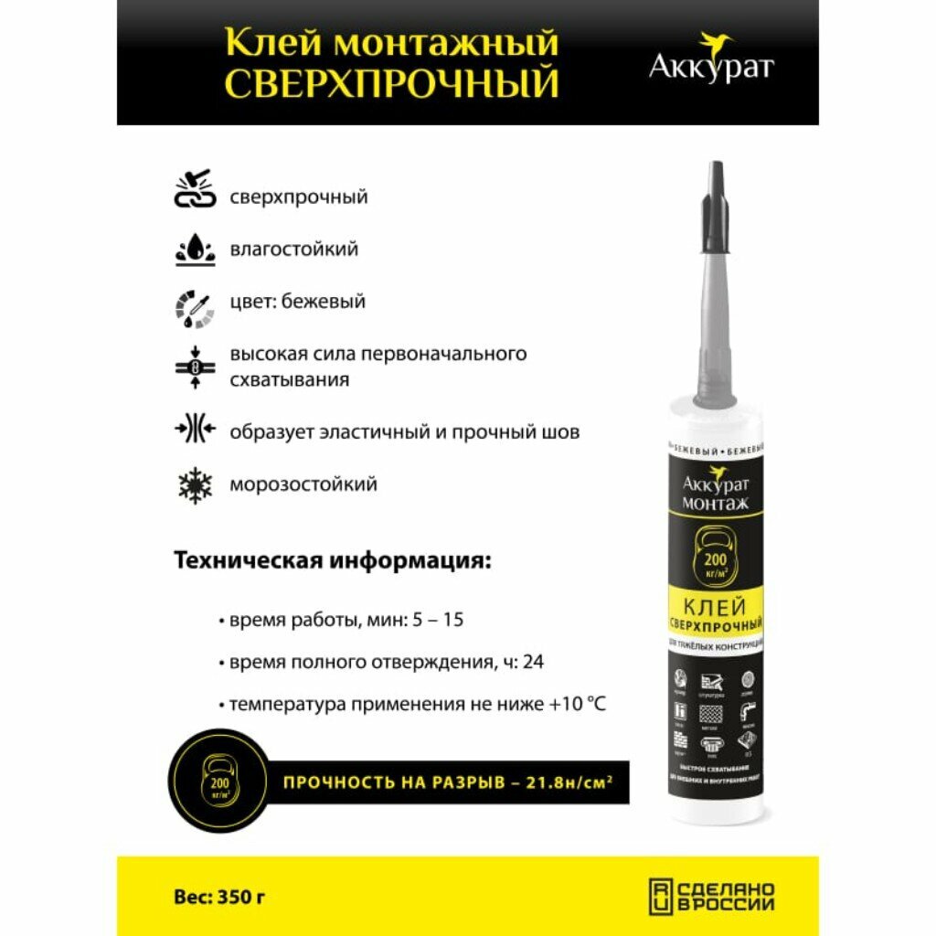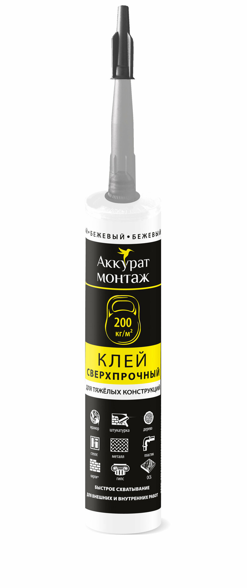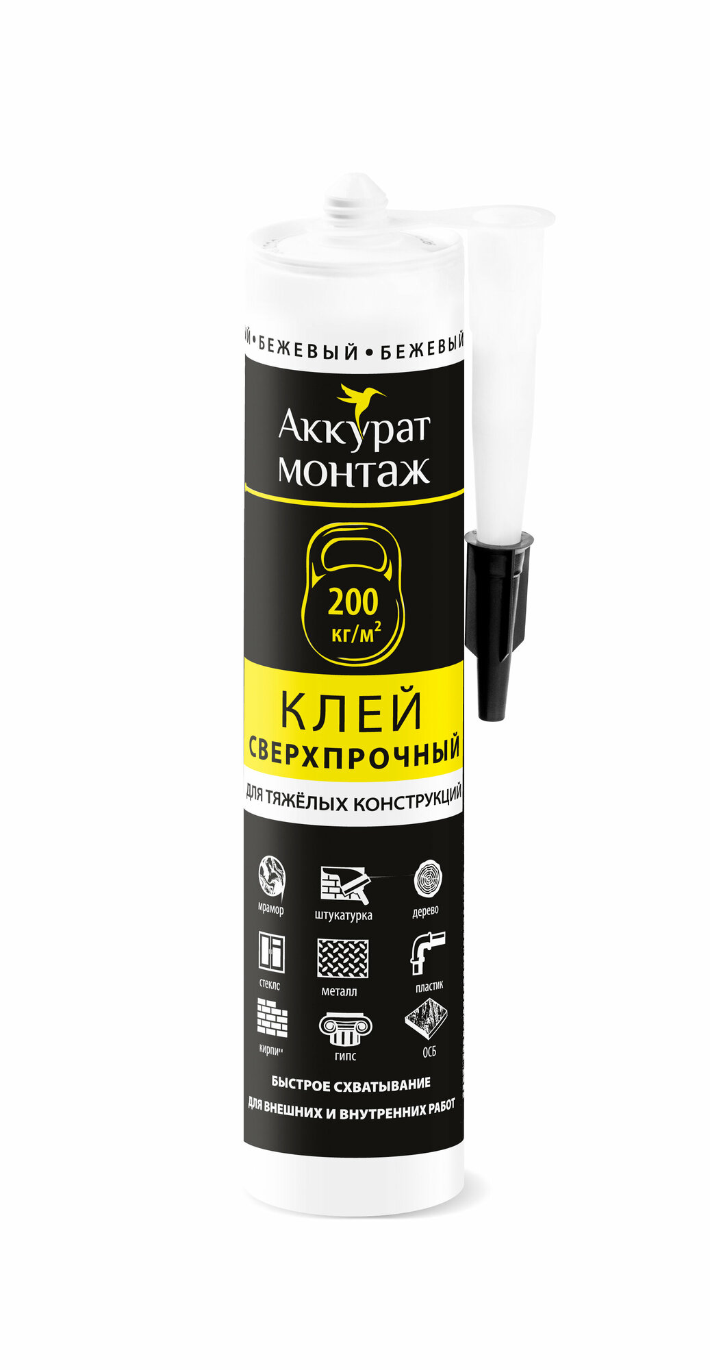 Клей монтажный Аккурат Сверхпрочный предназначен для склеивания элементов из тяжёлых материалов. Благодаря основе из каучука он обеспечивает надежное и прочное соединение.