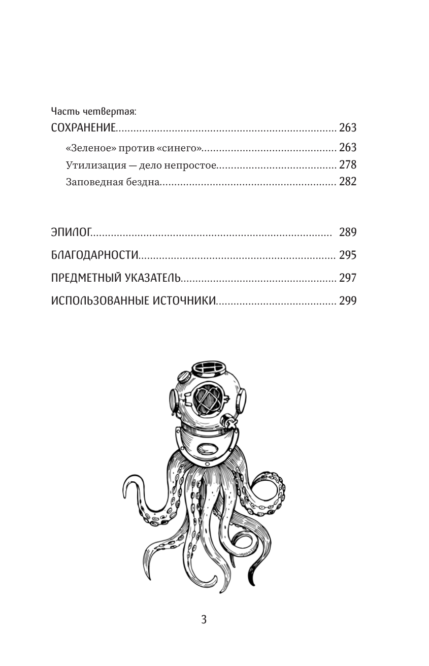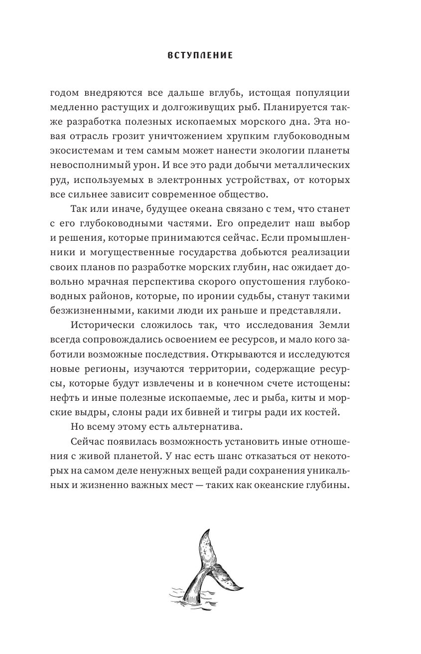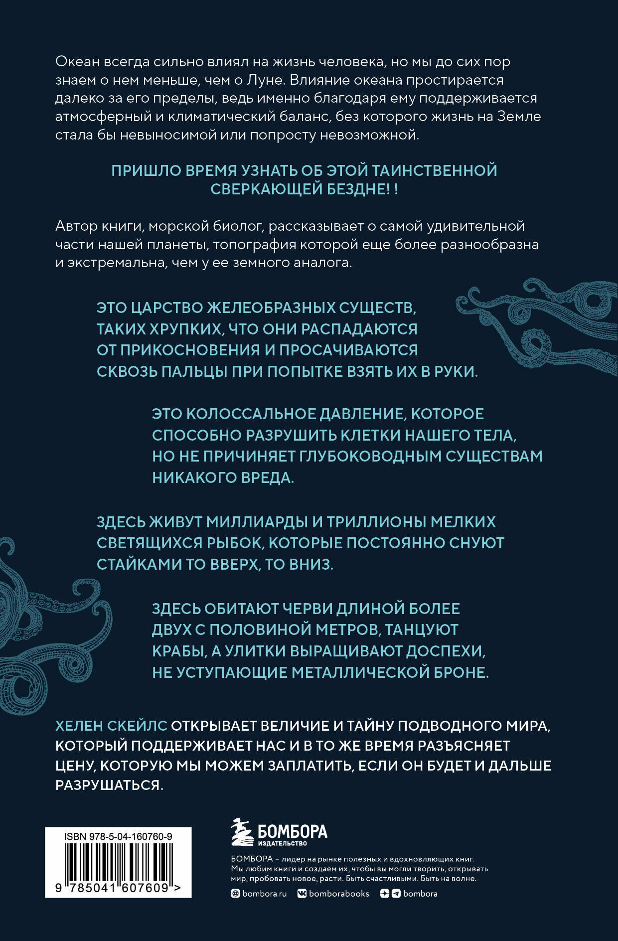 Что скрывает в себе темная, глубокая бездна? И какое влияние оказывает водная экосистема на нашу повседневную жизнь? Ответы на эти вопросы знает популярный морской биолог Хелен Скайлз. Морские глубины таят в себе множество чудес, но всего этого скоро не станет. Возможно, вместе с нашей планетой. Автор книги, морской биолог, рассказывает о самой удивительной части нашей планеты, топография которой еще более разнообразна и экстремальна, чем у ее земного аналога. Это царство желеобразных существ, таких хрупких, что они распадаются от прикосновения и просачиваются сквозь пальцы при попытке взять их в руки. Это колоссальное давление, которое способно разрушить клетки нашего тела, но не причиняет глубоководным существам никакого вреда. Здесь живут миллиарды и триллионы мелких светящихся рыбок, которые постоянно снуют стайками то вверх, то вниз. Здесь обитают черви длиной более двух с половиной метров, танцуют крабы, а улитки выращивают доспехи, не уступающие металлической броне. Фантастические существа, живущие на глубине, захватывают и улавливают огромное количество углерода, который в противном случае отравил бы нашу атмосферу; а новые, еще не открытые бактерии обещают создать новые мощные лекарства. Но глубоководная добыча ископаемых, рыболовство, бурение нефти — все это скоро полностью уничтожит морскую экосистему, сделав наш мир уязвимым и пустым. В этой книге Хелен Скайлз понятным и доступным языком объясняет, почему океан так важен и ценен для планеты и нашего выживания.