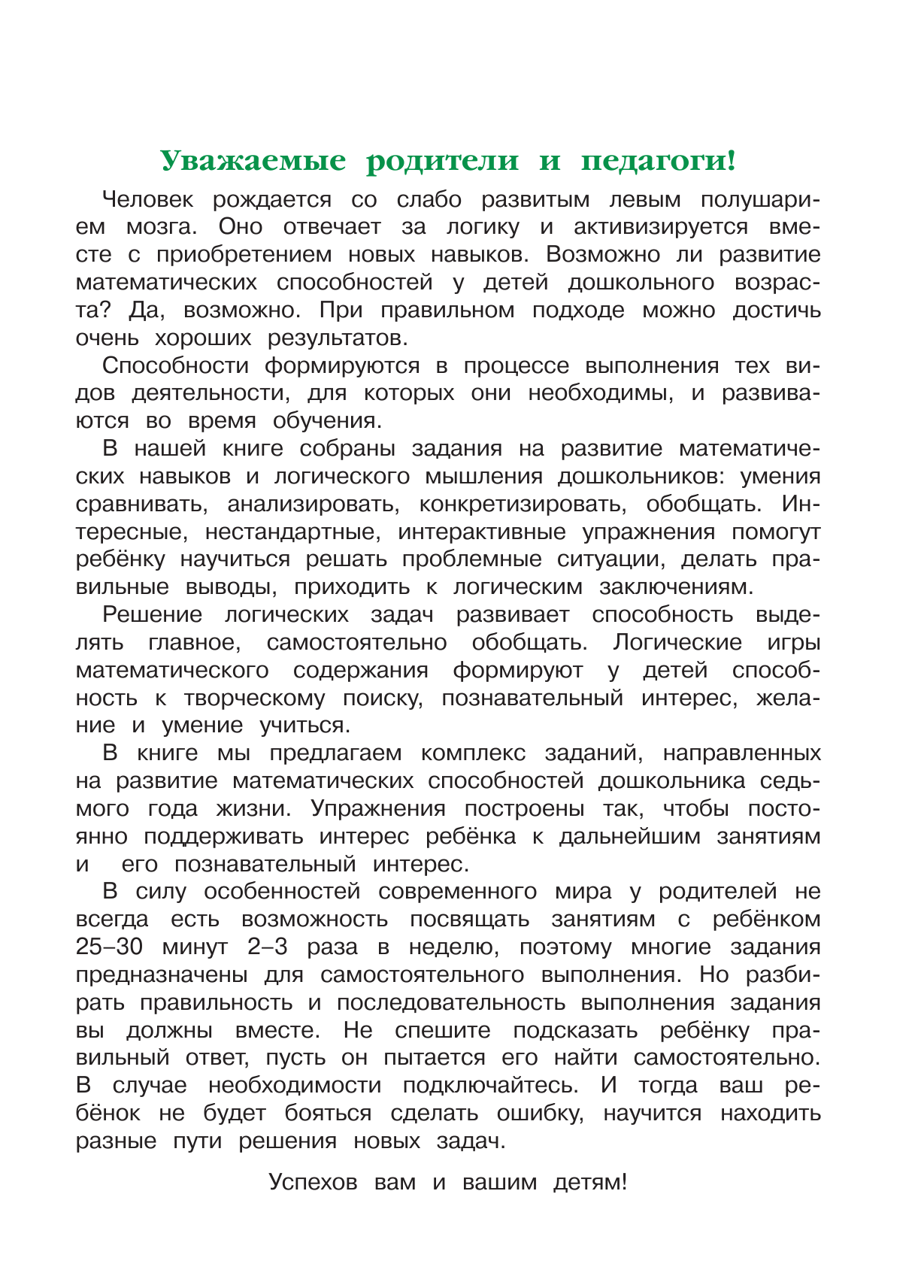 Легендарная серия обучающих пособий от издательства «Эксмо» для развития ребенка и подготовки к школе теперь в новом оформлении!Проверенная на практике и показавшая свою эффективность методика, умело сочетающая современные технологии обучения с лучшими классическими традициями российского образования, поможет дошкольнику развить математические способности.В книге собраны задания на развитие логического мышления и математических навыков: умения анализировать, сравнивать, обобщать, конкретизировать. Интересные нестандартные упражнения помогут ребенку научиться решать проблемные ситуации, делать правильные выводы, приходить к логическим заключениям. Все задания даны в игровой форме и построены по принципу усложнения. В одном занятии предлагаются сразу несколько типов заданий, чтобы побуждать ребенка постоянно думать и искать новые пути решения. В конце пособия имеются ответы к наиболее сложным заданиям.Книга будет отличным подарком талантливому любознательному ребенку 5—6 лет. Знания, умения и навыки, которые он приобретет в результате занятий, позволят ему в дальнейшем их успешно использовать и почувствовать уверенность в своих силах.