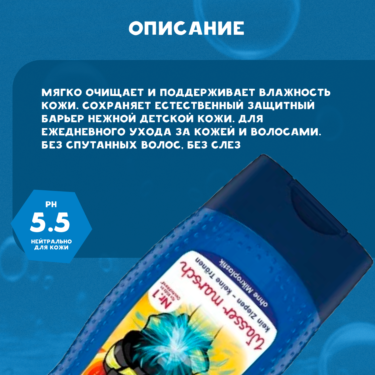 Для нежного очищения волос и кожи. С бодрящим запахом свежести. Идеален после занятий спортом. Совмещает в себе шампунь для мытья волос и гель для душа. Мягко удаляет загрязнения, питает волосы и кожу. Укрепляет волосы, облегчает их расчесывание и придает естественный шелковистый блеск. Использовать с 3-х лет.