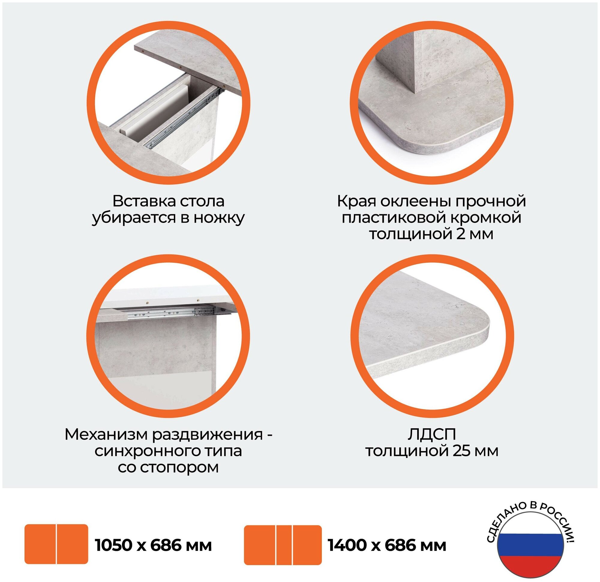 Кухонный стол Smart из коллекции Modern прекрасное решение простоты и функциональности. Прямоугольная столешница из ЛДСП толщиной 25 мм и оригинальная ножка-опора белого цвета и цвета Мрамор Блэк Роял - идеальное сочетание для современного стильного пространства. Края стола оклеены прочной пластиковой кромкой толщиной 2 мм, что значительно продлит срок его службы. При необходимости можно быстро и легко увеличить размеры стола с помощью центральной секции, для этого используется механизм синхронного типа со стопором. Вставка стола легко убирается в ножку. За столом с комфортом могут разместиться от 4 до 6 человек. Эта стильная и комфортная модель станет любимым местом отдыха в вашем доме. Стол Smart отлично подойдёт для гостиной, для кухни или для загородного дома. Стол очень прост в сборке, инструкция по сборке прилагается.