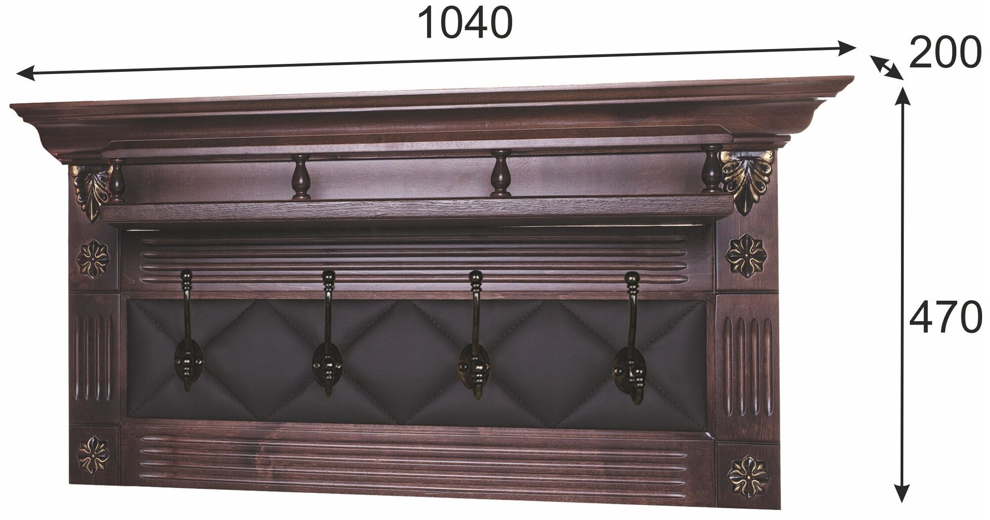 Настенная вешалка «Сильвия Н5», несмотря на свой размер, создает сильный классический акцент в прихожей. В отличии от модели «Н3», эта вешалка оставляет открытой стену. Это имеет значение, если стена в прихожей хорошо отделана и владелец хочет продемонстрировать качество отделки. Четыре крючка расположены в зоне с имитацией капитоне, выполненной из экокожи, и обрамленной массивной рамой с фрезеровками, создающими эффект пилястр. Рама изготовлена из массива березы. Декоративные объемные элементы по углам рамы патинированы в цвет бронзовых крючков. Массивный карниз завершает классический образ вешалки. Небольшая полочка служит для хранения мелочей. Декоративное ограждение полки одновременно и защищает вещи от падения и дополняет оформление вешалки.