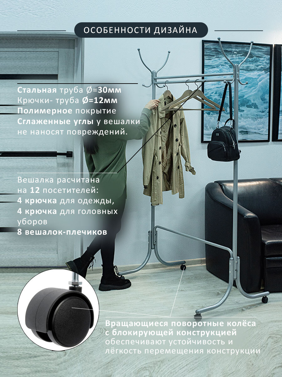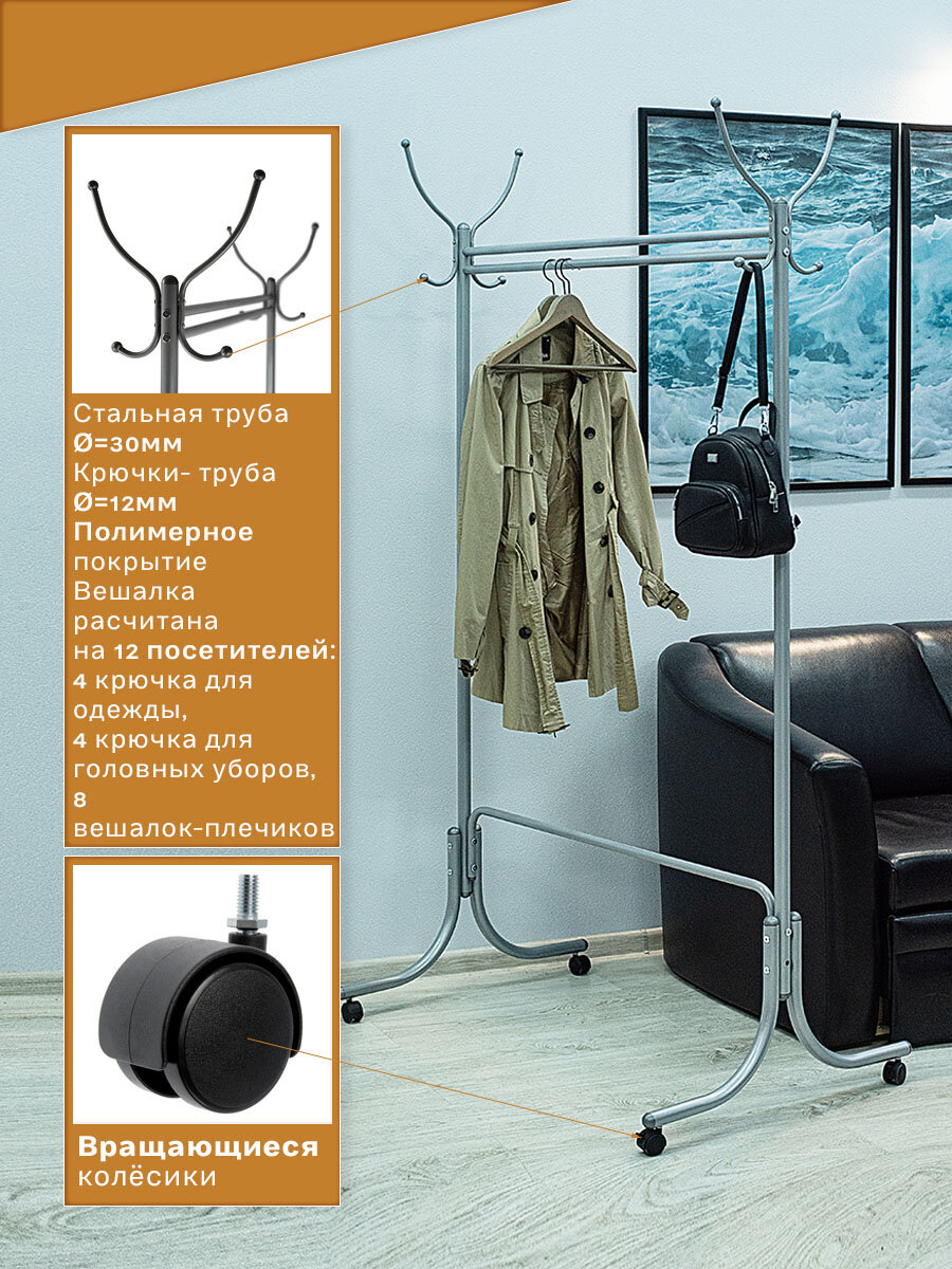 Классическая общественная офисная вешалка с крючками в виде цветочного бутона на колесах Вешалка расчитана на 12 посетителей: 4 крючка для одежды, столько же для головных уборов Рассчитана на 8 вешалок-плечиков Конструкция обеспечивает устойчивость при максимальной нагрузке Вешалка легко собирается без помощника, компактно упакованаВешалка напольная - незаменимый предмет для хранения верхней одежды и носимых вещей в коридор, прихожую. Будет хорошей альтернативой вешалке настенной. Отлично подойдет и для дома и как офисная. Крючки можно использовать и для плечиков, и для одежды, и для размещения органайзера. Отличный комплект в прихожую, в гардероб, в гардеробную комнату, в баню, в ванную, на балкон - вешалка напольная, настенное зеркало и банкетка в одном стиле. Вешалка стойка напольная для хранения вещей может быть как деревянная, так и металлическая.