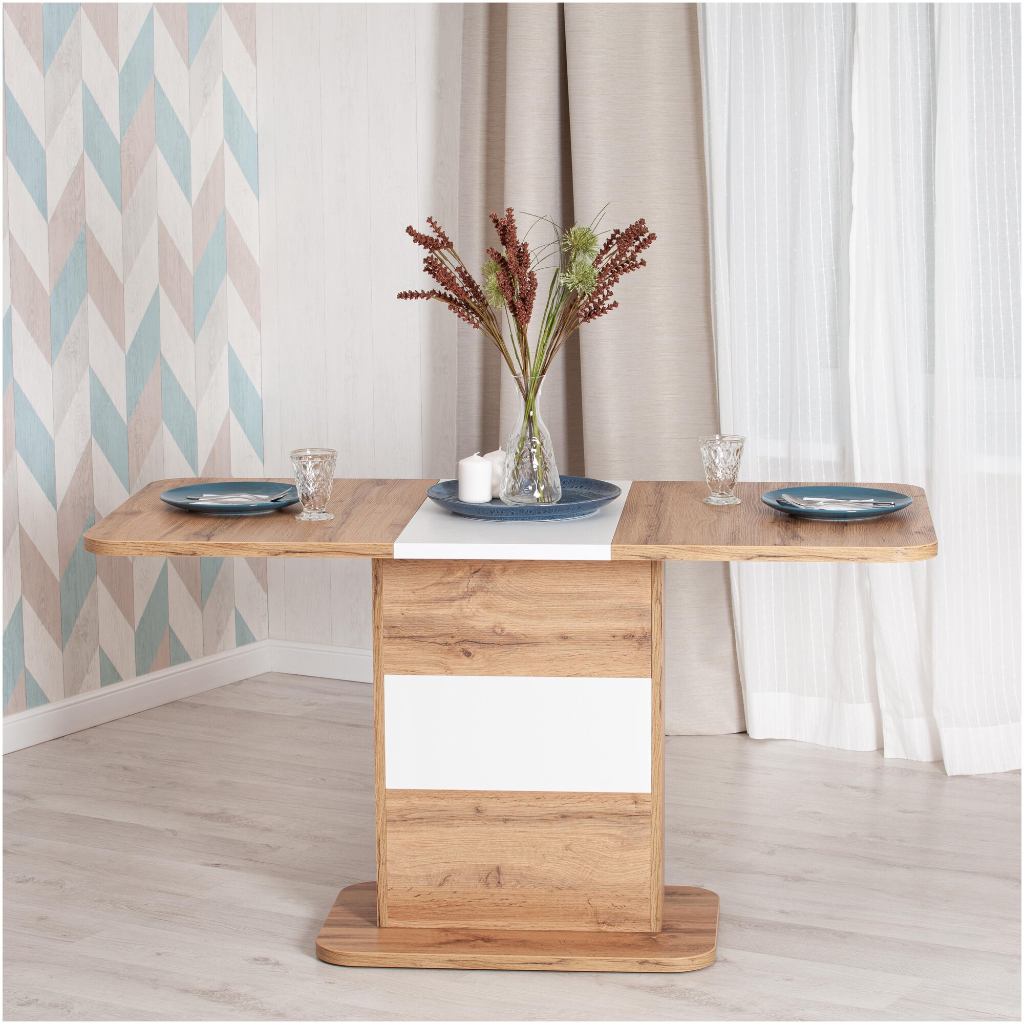Кухонный стол Smart из коллекции Modern прекрасное решение простоты и функциональности. Прямоугольная столешница из ЛДСП толщиной 25 мм и оригинальная ножка-опора белого цвета и цвета дуб - идеальное сочетание для современного стильного пространства. Края стола оклеены прочной пластиковой кромкой толщиной 2 мм, что значительно продлит срок его службы. При необходимости можно быстро и легко увеличить размеры стола с помощью центральной секции, для этого используется механизм синхронного типа со стопором. Вставка стола легко убирается в ножку. За столом с комфортом могут разместиться от 4 до 6 человек. Эта стильная и комфортная модель станет любимым местом отдыха в вашем доме. Стол Smart отлично подойдёт для гостиной, для кухни или для загородного дома. Стол очень прост в сборке, инструкция по сборке прилагается.