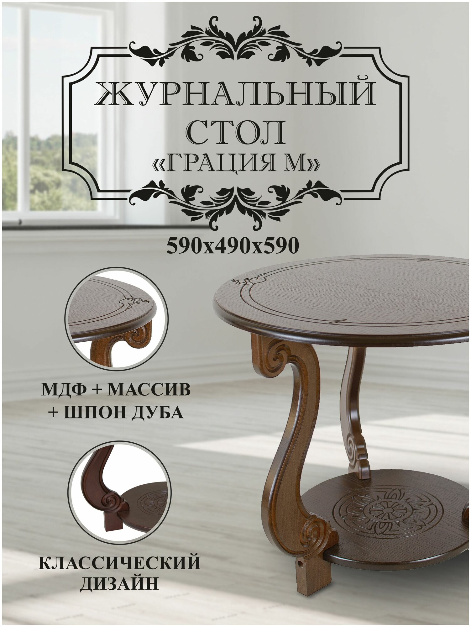 Круглый журнальный столик Грация М — отличный выбор для вашего интерьера. Он добавляет уют и тепло натурального дерева в вашу гостиную или спальню. Стол Грация М не только эстетичен, но и функционален.Сочетание столешницы из МДФ, покрытой шпоном дуба, и опор из массива бука обеспечивает исключительную надёжность и устойчивость к износу. Оригинальная гравировка добавляет уникальности изделию. Надежная конструкция гарантирует долговечность. Вместительная полка под столешницей отлично подходит для хранения книг и разных вещей.Стол журнальный Грация М гармонично впишется в любое помещение. Компактный размер изделия позволяет использовать его как прикроватный, сервировочный или кофейный столик. Этот предмет мебели станет украшением вашего пространства и практичным помощником.