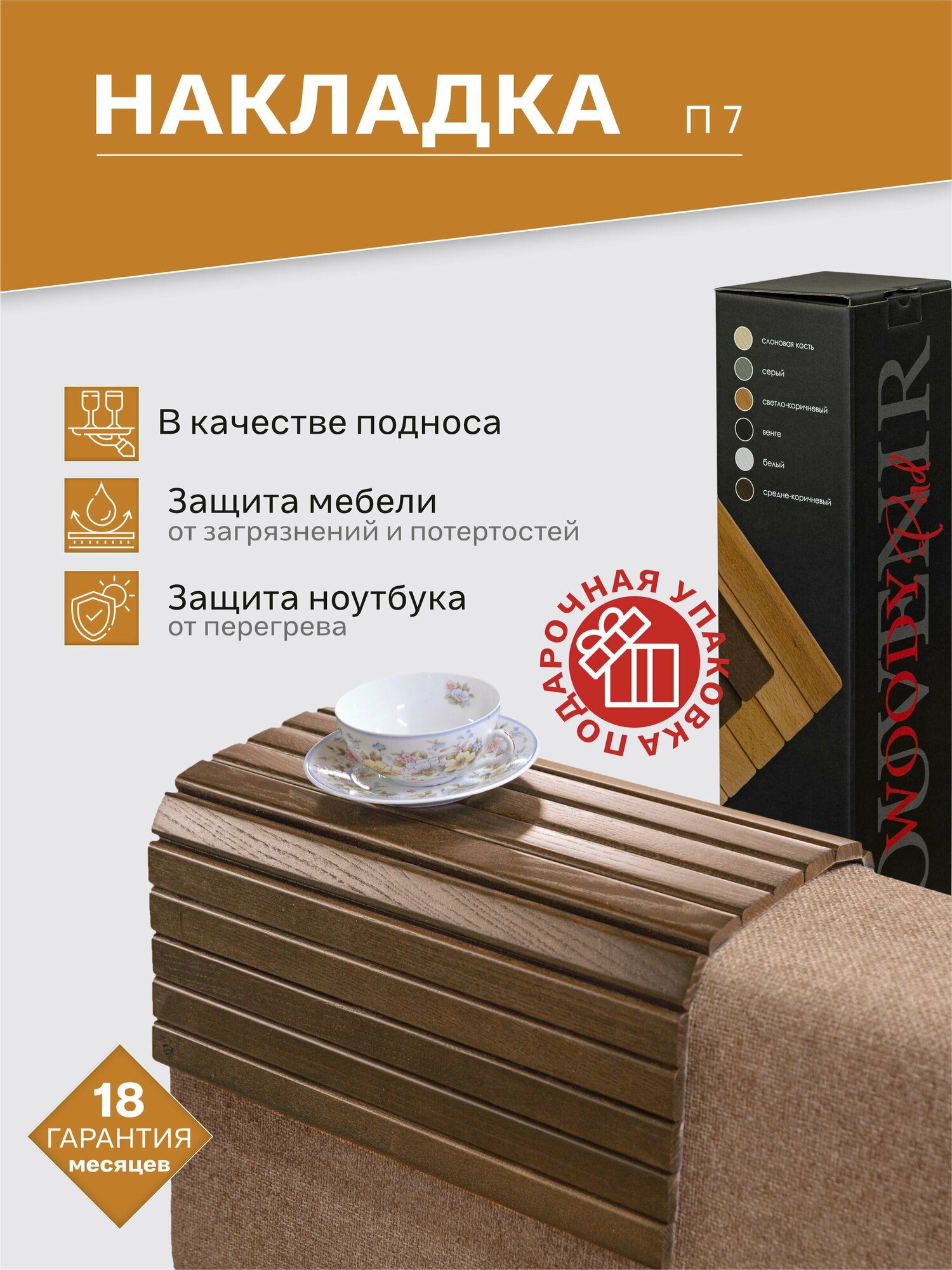 Накладка на диван П7 с одной стороны обеспечит вам твердую поверхность, а с другой – со своей мягкой стороны бережно будет соприкасаться с вашим дорогим диваном. Уникальная особенность Накладки на диван в том, что она отлично пристроится на подлокотник любой ширины!Вы можете использовать Накладку на диван П7 как обычный поднос для того, чтобы отнести на кухню посуду или столовые приборы, которые уже не нужны вам больше в гостиной. Для этого просто сложите накладку пополам и она превратится в настоящий поднос!С Накладкой на диван П7 вам не нужно бояться того, что ваш ноутбук перегреется, если вы его долго используете на мягкой поверхности. Ламели накладки сделаны таким образом, что обеспечивают отвод теплого воздуха из-под ноутбука даже если вы работаете с ним на мягкой перине. Накладка на диван П7 с одной стороны обеспечит вам твердую поверхность, а с другой – со своей мягкой стороны бережно будет соприкасаться с вашим дорогим диваном. Уникальная особенность Накладки на диван в том, что она отлично пристроится на подлокотник любой ширины!Вы можете использовать Накладку на диван П7 как обычный поднос для того, чтобы отнести на кухню посуду или столовые приборы, которые уже не нужны вам больше в гостиной. Для этого просто сложите накладку пополам и она превратится в настоящий поднос!С Накладкой на диван П7 вам не нужно бояться того, что ваш ноутбук перегреется, если вы его долго используете на мягкой поверхности. Ламели накладки сделаны таким образом, что обеспечивают отвод теплого воздуха из-под ноутбука даже если вы работаете с ним на мягкой перине.Подарите Накладку на диван П7 своему ребенку для того, чтобы он не жаловался на то, что ноутбук перегревается на постельном белье. Для заботливой хозяйки Накладка на диван П7 станет отличным помощником для защиты мебели от пролитой чашки кофе или протертых подлокотников дорогой мебели. Ламели накладки сделаны из натурального дерева и на них отлично проявляется его текстура, поэтому Накладка на диван П7 - отличный подарок для ценителей всего натурального.Накладка на диван П7 всегда будет чистой, так как уход за ней не представляет никаких сложностей. Ее можно пылесосить, протирать, а можно просто скрутив ее стряхнуть с нее все крошки. Накладка на диван П7 отблагодарит вас первоначальным блеском, если вы, протирая ее, используете любую полироль для ухода за мебелью, так как она и сама есть в некотором смысле мебель. Сверните накладку и она поместится в любой кухонный ящик! Вам не нужно искать для нее специальное место для хранения, и она всегда будет у вас под рукой!
