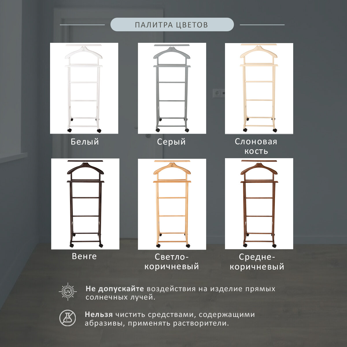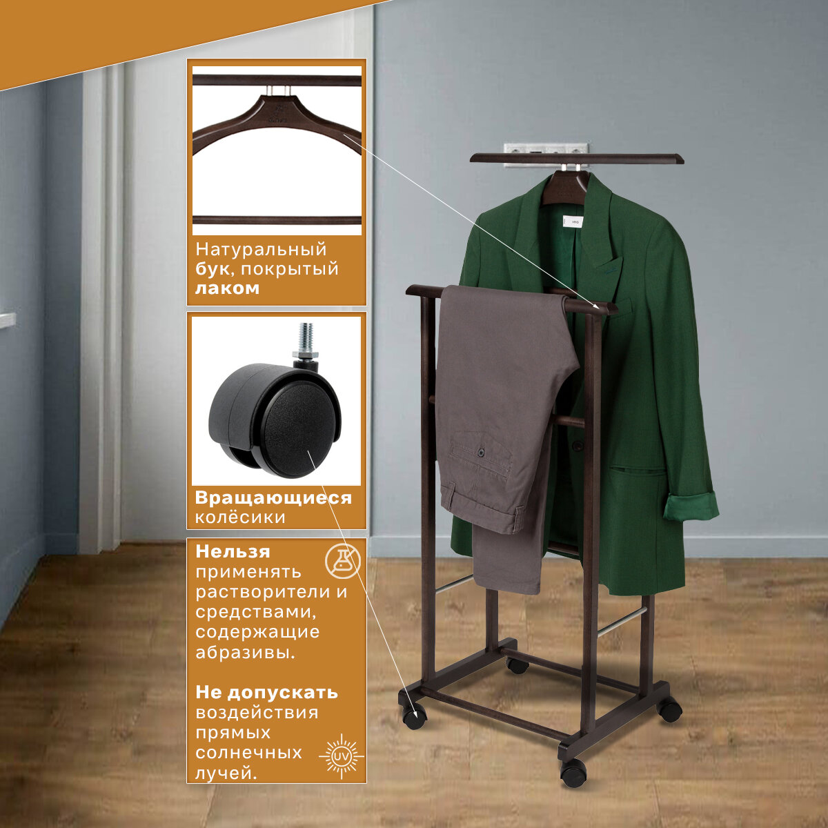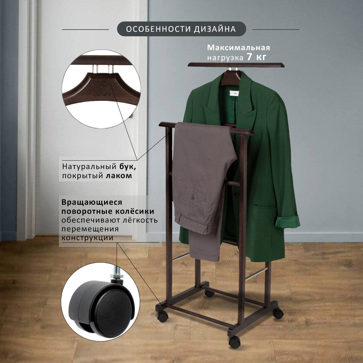 Костюмная вешалка В 22Н сочетает в себе элегантный дизайн и практичность. Она станет идеальным решением для тех, кто ценит порядок и организацию. Деревянное изделие выполнено из цельного массива бука, придающего прочность и долговечность. Специальное покрытие защищает одежду от потёртостей и повреждений.Благодаря наличию колёсиков В 22Н легко перемещать по квартире или дому. В спальне она станет отличным местом для хранения вещей. Ваша одежда всегда будет выглядеть безупречно и великолепно. В гардеробной разместите на функциональном предмете мебели брюки, пиджак и другие вещи. Оптимальная палитра цветов позволяет реализовать любые интерьерные решения. Максимально лёгкая сборка дополняет все преимущества изделия. Ещё один вариант – поставить вешалку в детскую комнату. Вашим детям будет легче соблюдать порядок, а их школьная форма всегда будет в идеальном состоянии. Максимальная нагрузка 7 кг.
