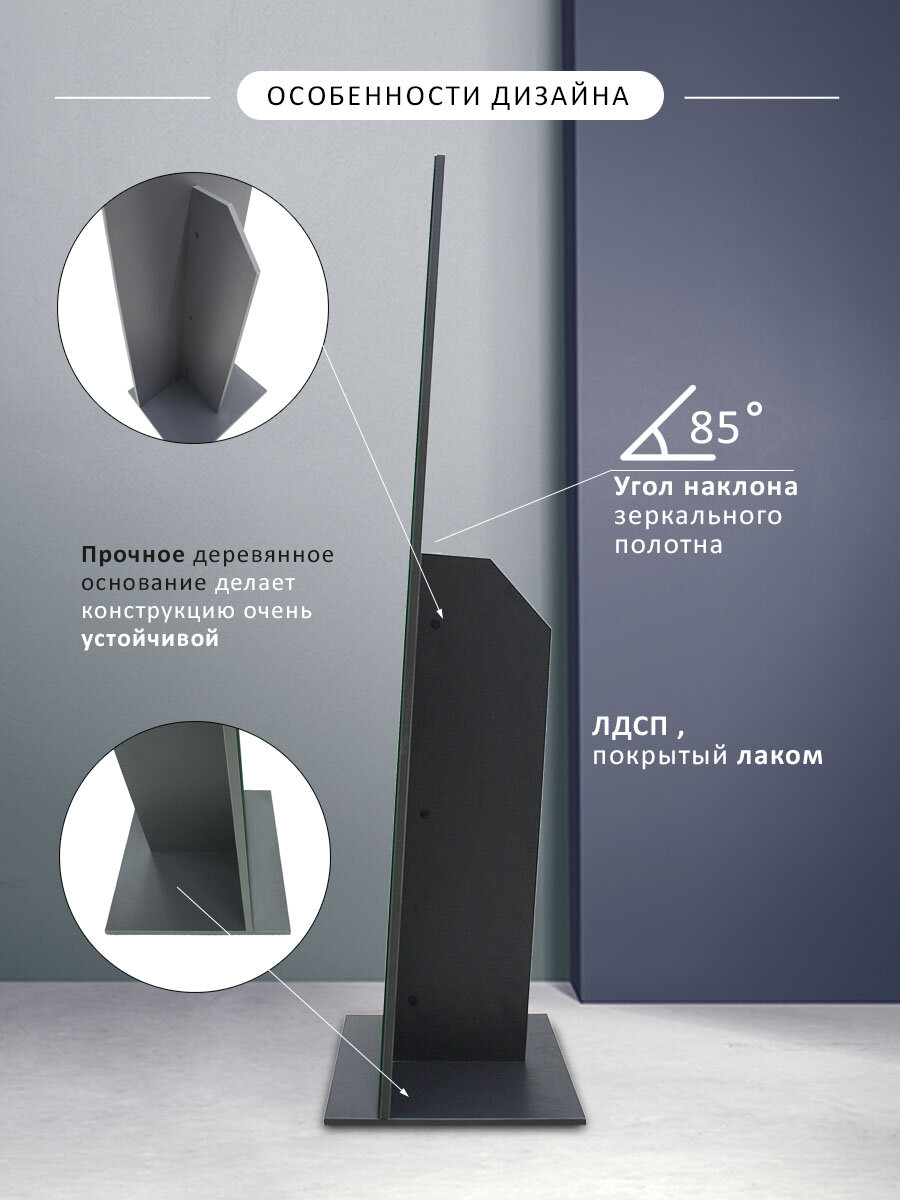 Зеркало Стелла 2 – отличная альтернатива настенному варианту. Напольную модель удобно перемещать в пространстве. Её приобретение – идеальное интерьерное решение для тех, кто не желает портить стену при установке зеркала. Отметим, что благодаря прочной конструкции массивный предмет надёжно стоит на полу.