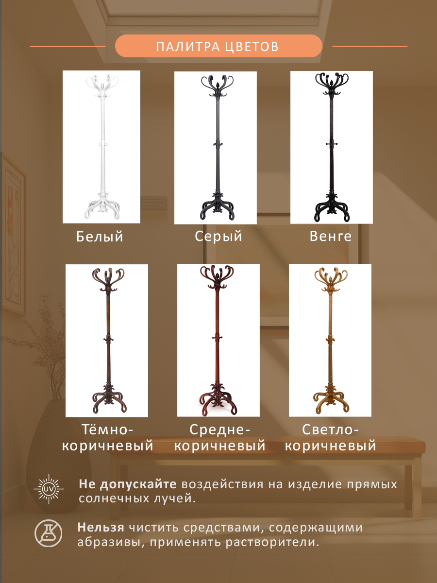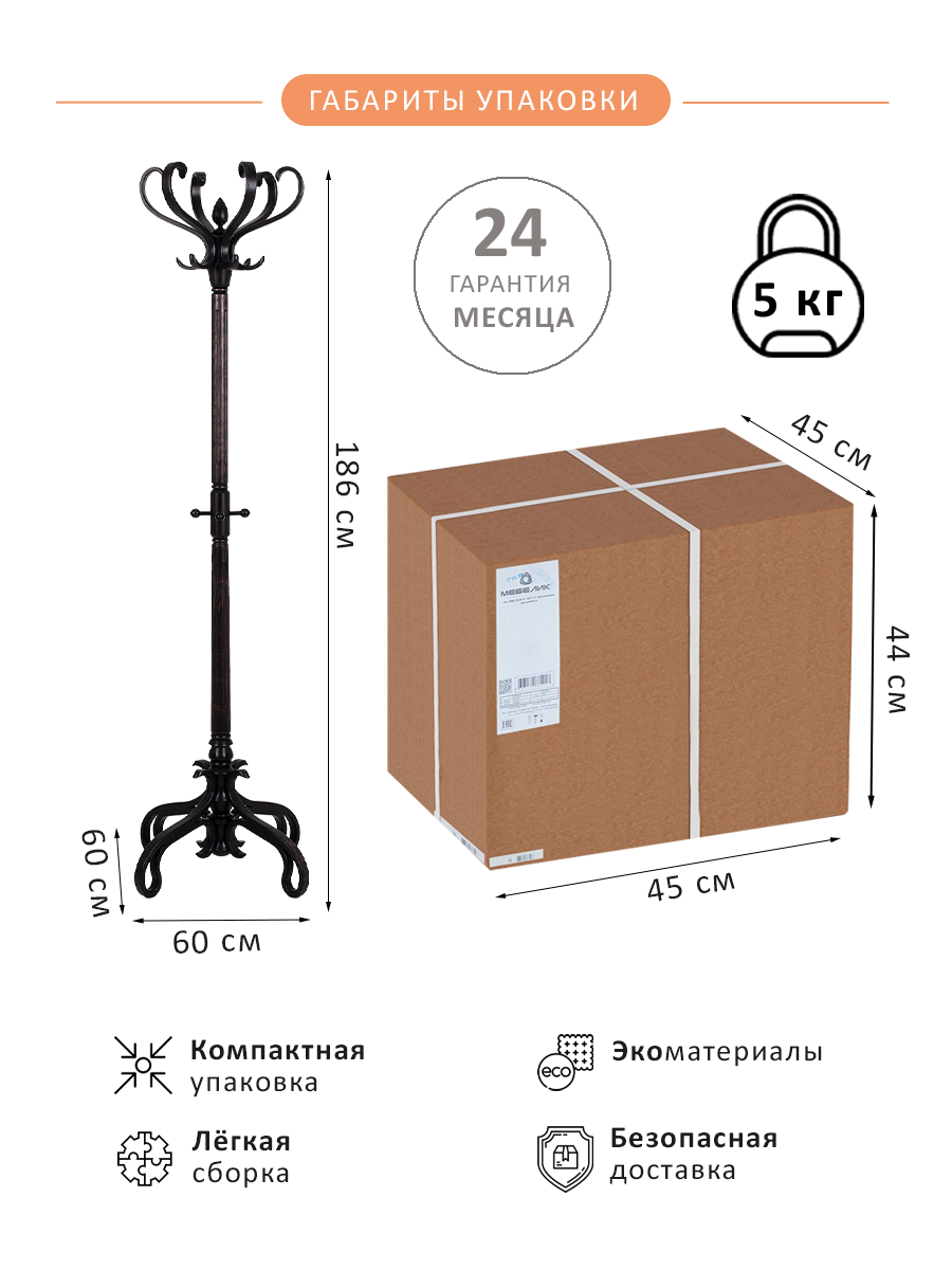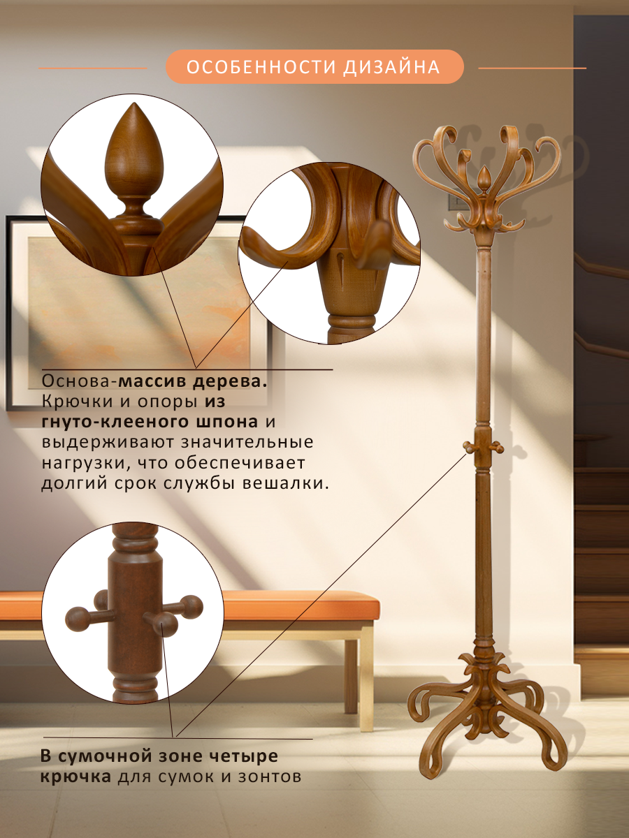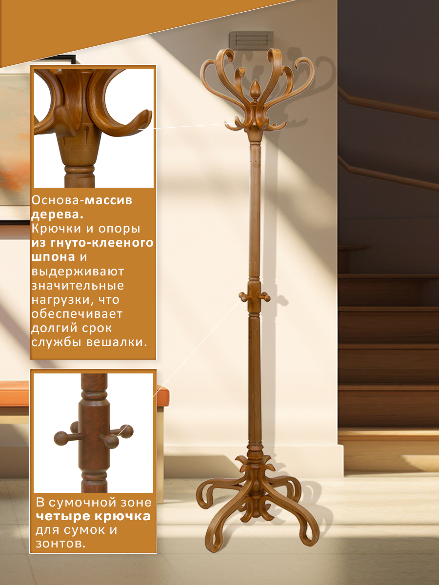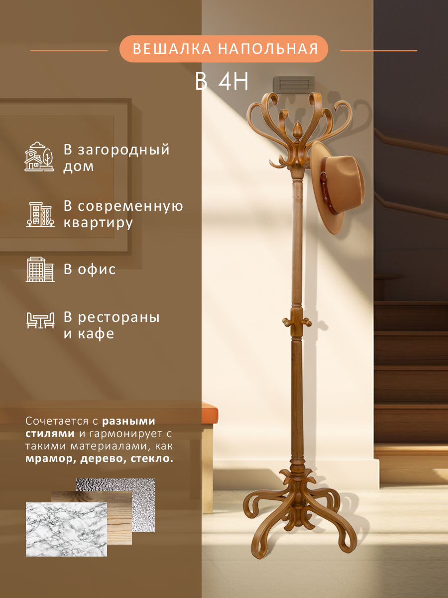 Вешалка В4Н - классическая элегантная вешалка для верхней одежды из массива натурального дерева в кабинет, приемную, офис, кафе. Очень часто эту вешалку используют и в домашних интерьерах - в прихожих, домашних кабинетах и даже в спальнях. Вешалка оснащена шестью крючками для верхней одежды, шестью крючками для головных уборов. Крючки и опоры вешалки изготовлены по технологии гнуто-клееного шпона и выдерживают значительные нагрузки, что обеспечивает долгий срок службы. В данной модели крючки и опоры изготовлены вручную, что позволило достичь высокого эстетического качества. Кроме того в сумочной зоне есть четыре крючка для сумок и зонтов. Массив дерева – универсальный и привычный материал в мебели, за счет своих свойств элементы интерьера из натурального дерева всегда уместны в обстановке. Вешалка компактно упакована и для ее транспортировки не требуется прибегать к помощи грузового такси, ее можно транспортировать даже в общественном транспорте. При этом она легко собирается – все элементы просто скручиваются между собой. За счет разноса опор вешалка устойчива, а толщина крючков позволяет уверенно пользоваться вешалкой даже в заведениях с большой проходимостью.