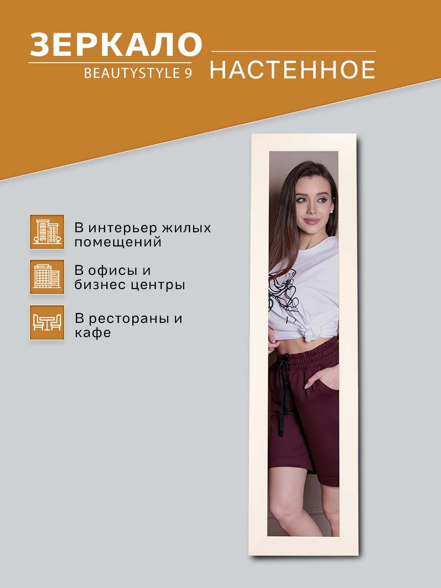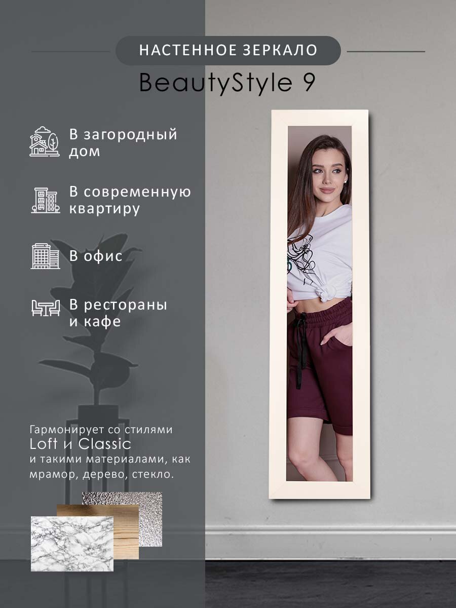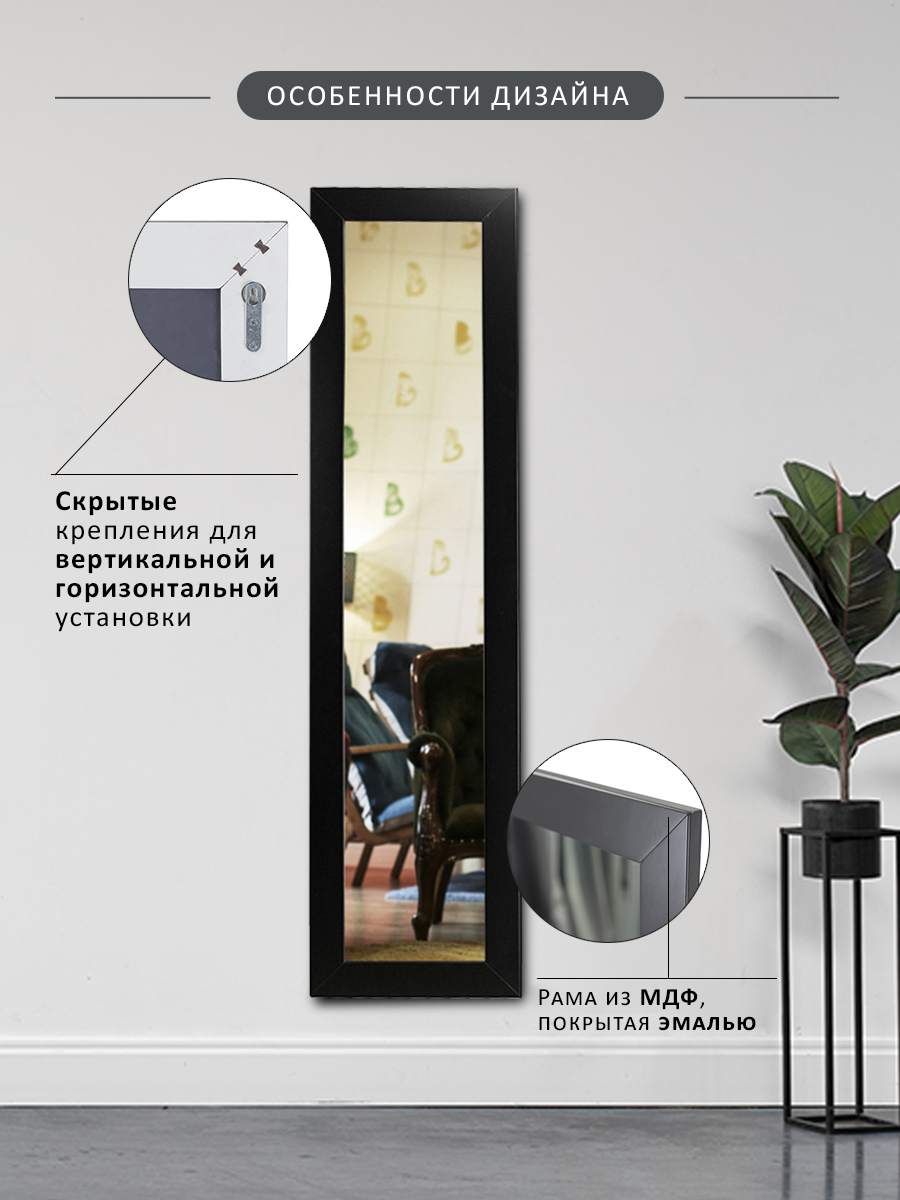Практически всегда в небольшом офисе возникает необходимость поместить зеркало. Данная модель – идеально подойдет для решения этой задачи. Зеркало компактно – всего 35см шириной, не занимает много места, и при этом позволяет рассмотреть себя в полный рост. В зависимости от ваших предпочтений, вы можете выбрать один из цветов оформления – белый, или нейтральный черный. Оба цветовых варианта не акцентируют на себе внимания и не отвлекают от работы сотрудников. Эта модель так же будет полезной для новоселов, молодых семей, для использования во временном или съемном жилье. Необходимый практичный предмет интерьера любого пространства, не обременяющий бюджет и создающий комфортную обстановку. ___ Интерьерное зеркало в полный рост всегда украсит обстановку и станет местом притяжения гостей. Если площадь помещения небольшая, то лучшим вариантом станет зеркало напольное в раме на колесах с меняющимся углом наклона. Зеркало в раме можно использовать в разных помещениях, и как зеркало в прихожую, коридор, гардеробную, гостиную, спальню. Если вы выбираете зеркало в ванную, обратите внимание на материалы рамы, они должны быть влагостойкими. Актуально в раму зеркала встраивать подсветку, чтобы было удобнее наносить макияж. Специфические характеристики и декор важны, если зеркало подбирается в общественные помещения. Тандем из зеркала и туалетного столика - мини салон красоты у вас дома.