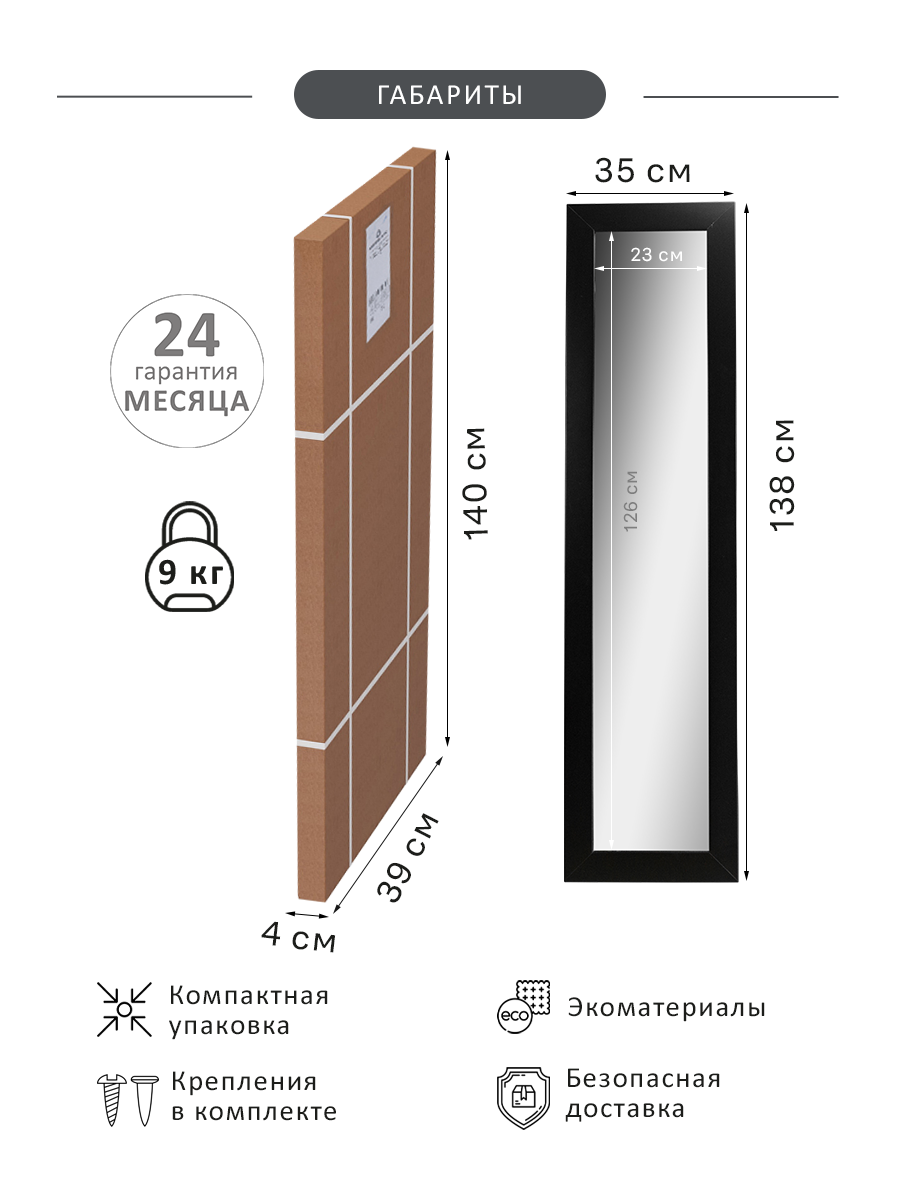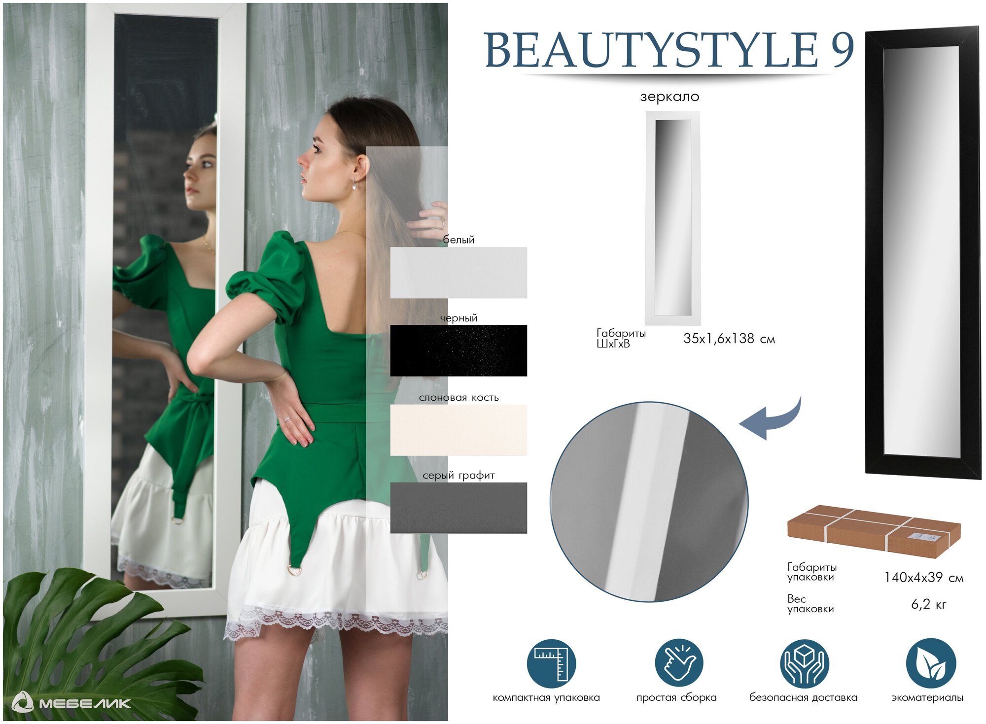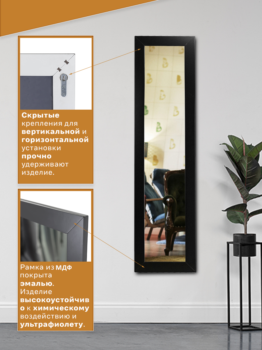 Практически всегда в небольшом офисе возникает необходимость поместить зеркало. Данная модель – идеально подойдет для решения этой задачи. Зеркало компактно – всего 35см шириной, не занимает много места, и при этом позволяет рассмотреть себя в полный рост. В зависимости от ваших предпочтений, вы можете выбрать один из цветов оформления – белый, или нейтральный черный. Оба цветовых варианта не акцентируют на себе внимания и не отвлекают от работы сотрудников. Эта модель так же будет полезной для новоселов, молодых семей, для использования во временном или съемном жилье. Необходимый практичный предмет интерьера любого пространства, не обременяющий бюджет и создающий комфортную обстановку. ___ Интерьерное зеркало в полный рост всегда украсит обстановку и станет местом притяжения гостей. Если площадь помещения небольшая, то лучшим вариантом станет зеркало напольное в раме на колесах с меняющимся углом наклона. Зеркало в раме можно использовать в разных помещениях, и как зеркало в прихожую, коридор, гардеробную, гостиную, спальню. Если вы выбираете зеркало в ванную, обратите внимание на материалы рамы, они должны быть влагостойкими. Актуально в раму зеркала встраивать подсветку, чтобы было удобнее наносить макияж. Специфические характеристики и декор важны, если зеркало подбирается в общественные помещения. Тандем из зеркала и туалетного столика - мини салон красоты у вас дома.