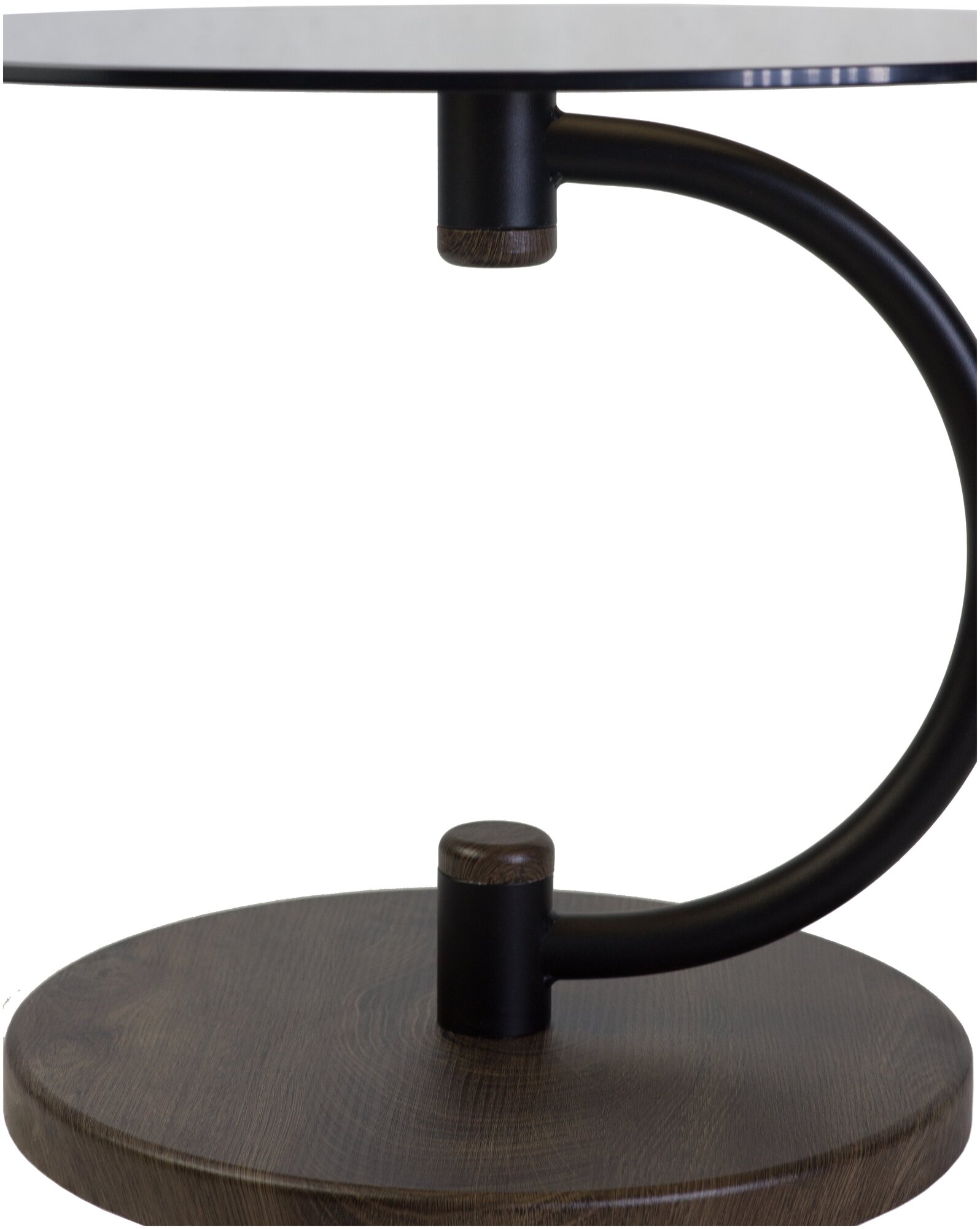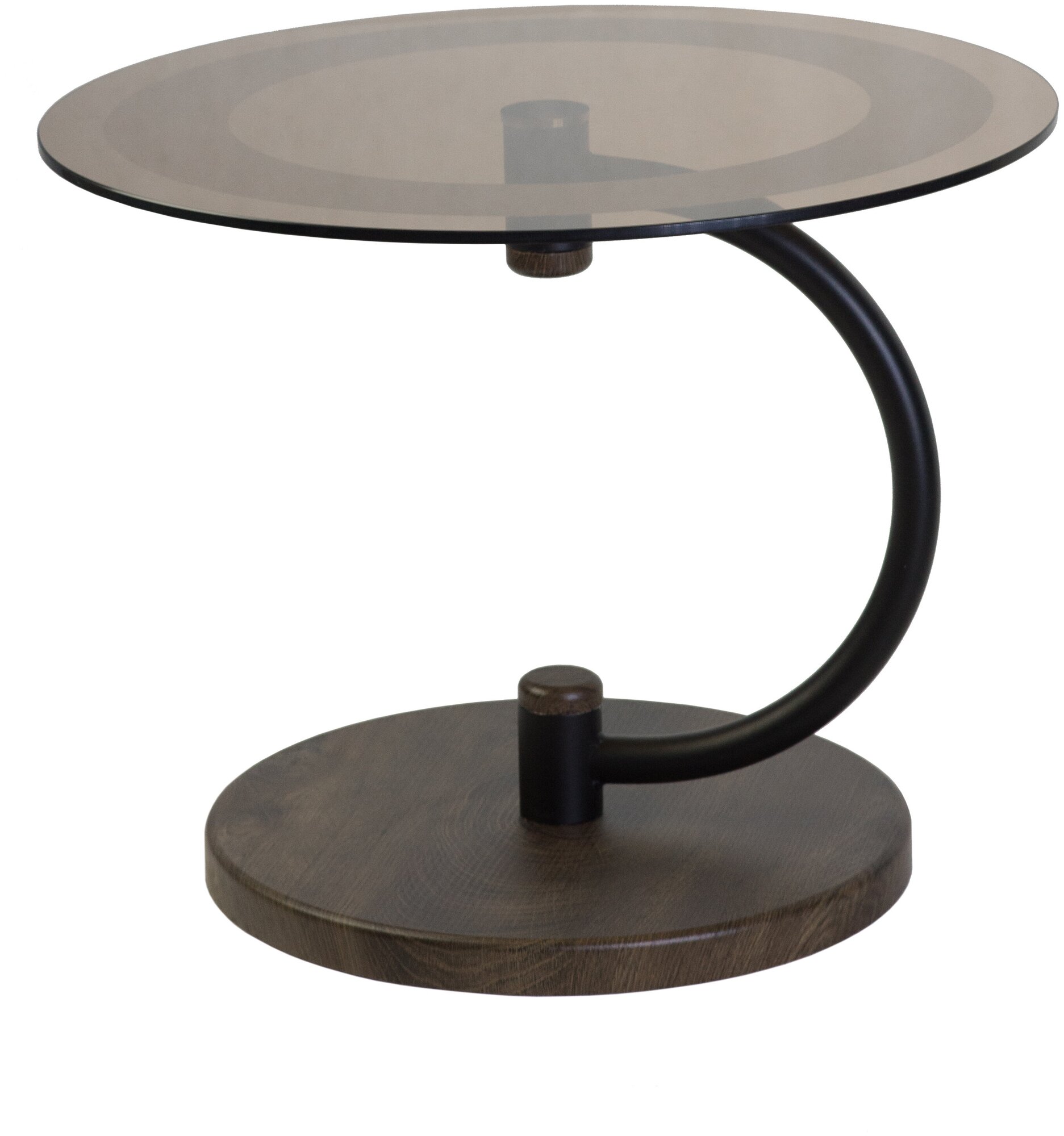 Небольшой, но массивный – вес 12кг! и устойчивый журнальный стол со стеклянной столешницей диаметром 60см, мощным основанием диаметром 42см из лмдф и опорой в виде полукруга идеально подойдет для оформления зон отдыха офисных и общественных помещений, современных частных интерьеров.Мы увеличили цветовые варианты отделки до пяти и теперь еще более просто стало подобрать подходящий вариант под ваш интерьер. Средне-коричневый, слоновая кость, дуб дымчатый, дуб крымский состаренный, дуб маррон – это варианты отделки основания и декоративных элементов, черный, или металлик – варианты цвета опоры, и, кроме того, на выбор – прозрачное, либо тонированное стекло с пескоструйным рисунком в виде кольца. В комплекте фетровые подпятники – для исключения повреждения пола песком и другими абразивами.Стол компактно упакован в одну коробку, очень легко собирается, гигиеничен, прост в уходе, долго прослужит при интенсивном использовании. Стол сочетается с напольными вешалками серии «Декарт». Отличный выбор за справедливую цену.