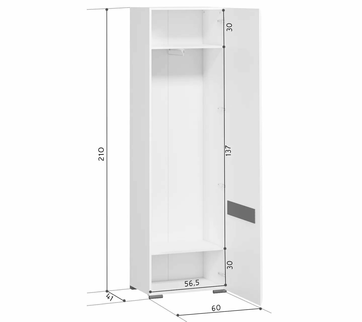 Белорусский шкаф Azteca – это узкая модель на ножках с одной распашной дверью и глухими фасадами. Для достижения высокой вместительности производитель максимально использовал высоту и довел ее до 210 см. Модель имеет небольшую ширину (60 см), но даже при таких параметрах она создаст комфортную зону для хранения вещей.Одностворчатый шкаф Azteca сделан по типу пенала. Его узкая конструкция занимает небольшое пространство и не утяжеляет интерьер. Внутри такого шкафчика располагаются две компактные ниши и металлическая штанга для хранения одежды. Модель такой комплектации подойдет для прихожей, спальни и детской. На верхних полках можно хранить головные уборы, внизу – коробки с обувью и любые предметы быта.Белые глянцевые фасады шкафа Azteca эффектно контрастируют с рифлеными декоративными планками цвета дуба Венге, а цилиндрические ножки аналогичного оттенка придают ему статусный вид. Лаконичный декор и минимальная комплектация позволяет смело отнести такую мебель к современному стилю. Добавляют приятных моментов интегрированные ручки и фурнитура, работающая как часы – мягко, плавно и без скрипа.В коллекции «Ацтека» еще есть платяные шкафы, трех- и четырехстворчатые с зеркалами, больше напоминающие гардеробные системы.