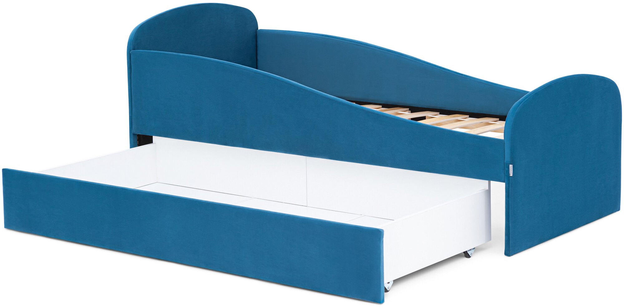 Детская мягкая кровать Бельмарко “Letmo” – это комфортное место для сна и игр мальчика или девочки от 2 до 10-12 лет.Материалы.Кровать изготовлена из ЛДСП класса Е1. ЛДСП обклеивается поролоном 10 мм, далее кровать обшивается чехлом из велюра или рогожки. В результате, бортики получаются мягкие и безопасные для сна.Конструкция.Кровать оборудована мягкими бортиками, которые защищает малыша от падения во время сна. Бортики закрывает кровать не по всей длине, а только ее верхнюю часть, благодаря такому конструктиву, ребёнок легко сможет сам забираться на свое спальное место. Бортики одинаковой высоты и формы с обеих сторон, поэтому кроватку можно поставить к стене любой стороной.Высота от пола до основания матраса составляет 31 см. Данная высота позволяет маленькому ребенку легко залезать и слезать с кроватки.Предусмотрено ортопедическое основание под матрас, состоящее из 12 лат, эта специальная конструкция легко выдерживает вес до 200 кг. Металлическая стяжка, соединяющая царги, служит дополнительным креплением.Кровать оборудована большим вместительным моно ящиком, в котором будет удобно хранить игрушки или постельные принадлежности. Ящик легко выдвигается за счет прорезиненных колесиков, которые не поцарапают ваш пол.Особые свойства.Кровать выполнена в минималистичном скандинавском стиле, который очень популярен сейчас в интерьере. Мягкая обивка придает уют и приятна на ощупь.Сборка простая и осуществляется самостоятельно.Комплект кровати состоит из каркаса кровати, большого ящика и ортопедического основания. Матрас и постельные принадлежности приобретаются отдельно.