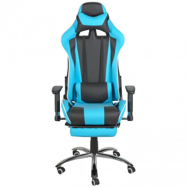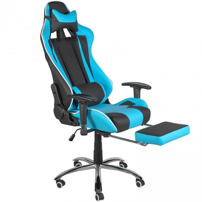 Игровое кресло MF-6005 черного цвета с ярко-голубыми вставкми с основанием из прочного хрома, высокой спинкой, подушкой под поясницу, подставкой для ног. Современный и яркий дизайн подойдет к любому интерьеру: от дома до офиса. Хромированная крестовина выдерживает нагрузку до 120 кг. при весе изделия в 21,5 кг. Колесики дают возможность свободно перемещать его в пространстве, поддержка поясницы обеспечивает дополнительным уровнем комфорта.Характеристики:1. Основание: металл;2. Подлокотники: пластик с мягкими накладками;3. Высота спинки: 85 см;5. Высота сидения: 50-60 см.;6. Нагрузка: 120 кг.;7. Механизм: топ-ган;8. Вес: 21,5 кг.;9. Страна производства: Китай.