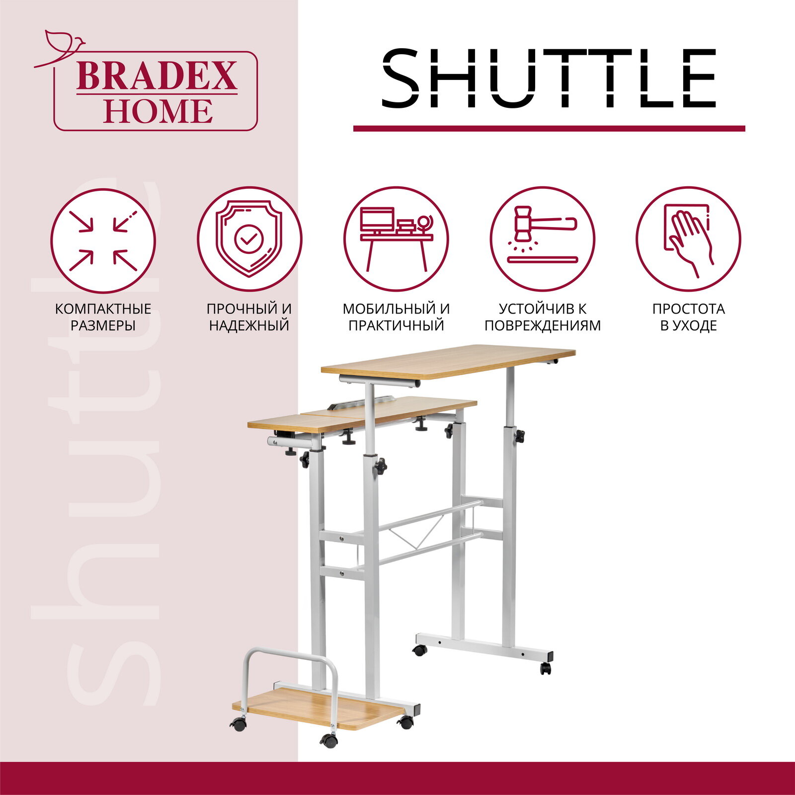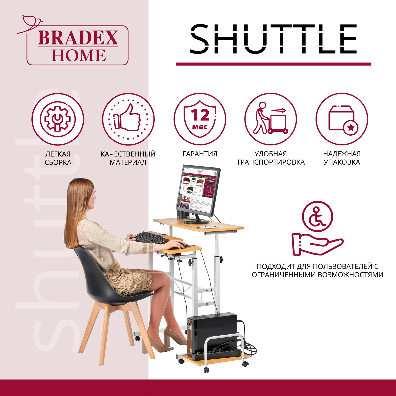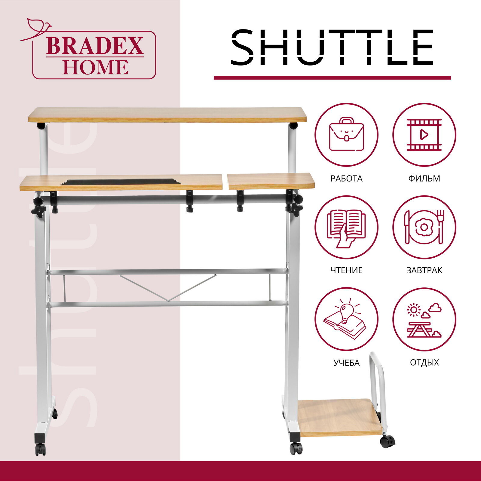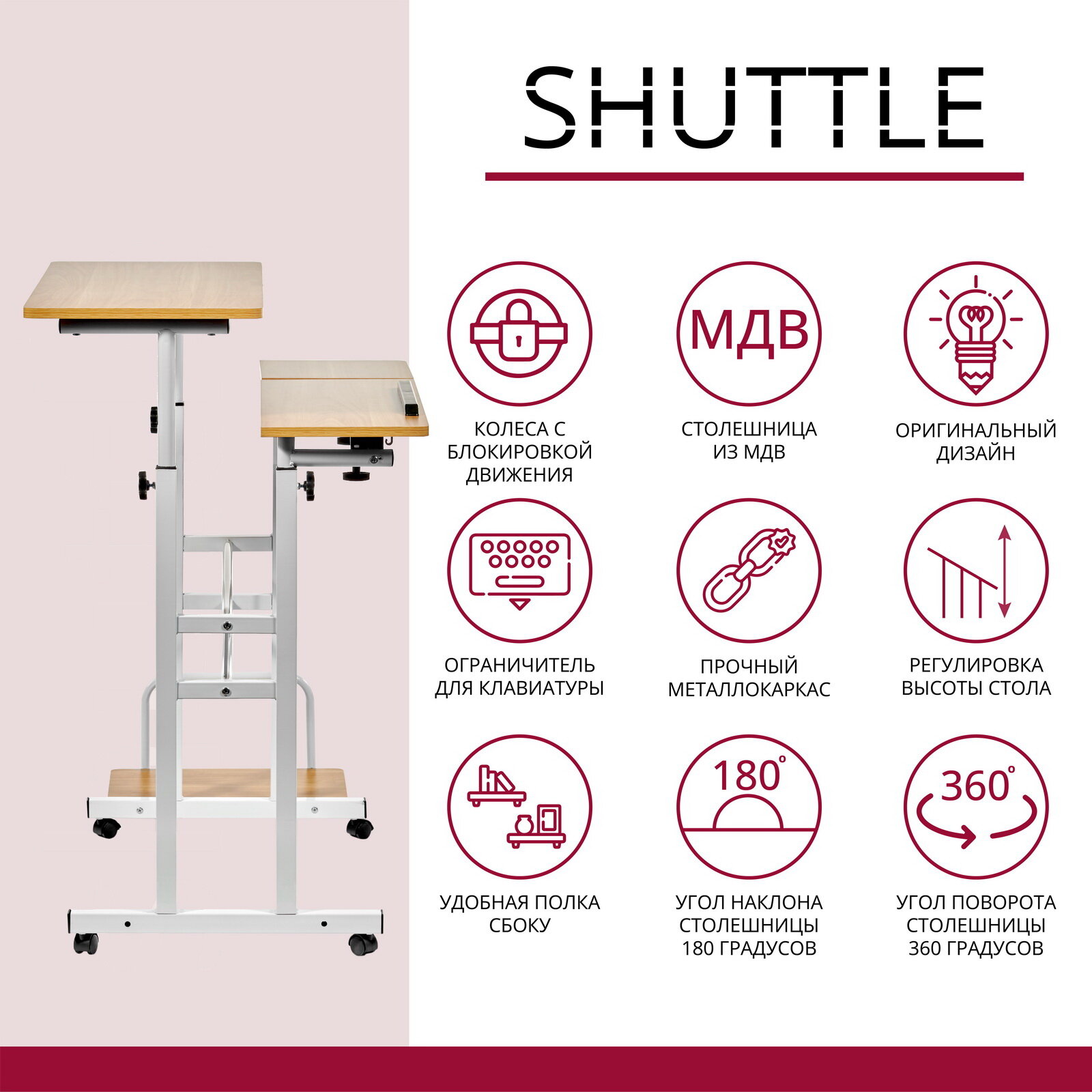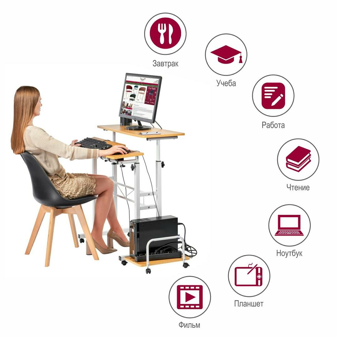 Стол ", Shuttle", настоящая находка для владельцев полноразмерных домашних компьютеров. На отдельных специальных поверхностях можно разместить монитор и системный блок. Раздельные поверхности для клавиатуры и мыши можно отрегулировать под разным углом, а ограничитель не позволит клавиатуре соскальзывать. В целом, стол позволит полноценно работать за компьютером не загромождая пространство.