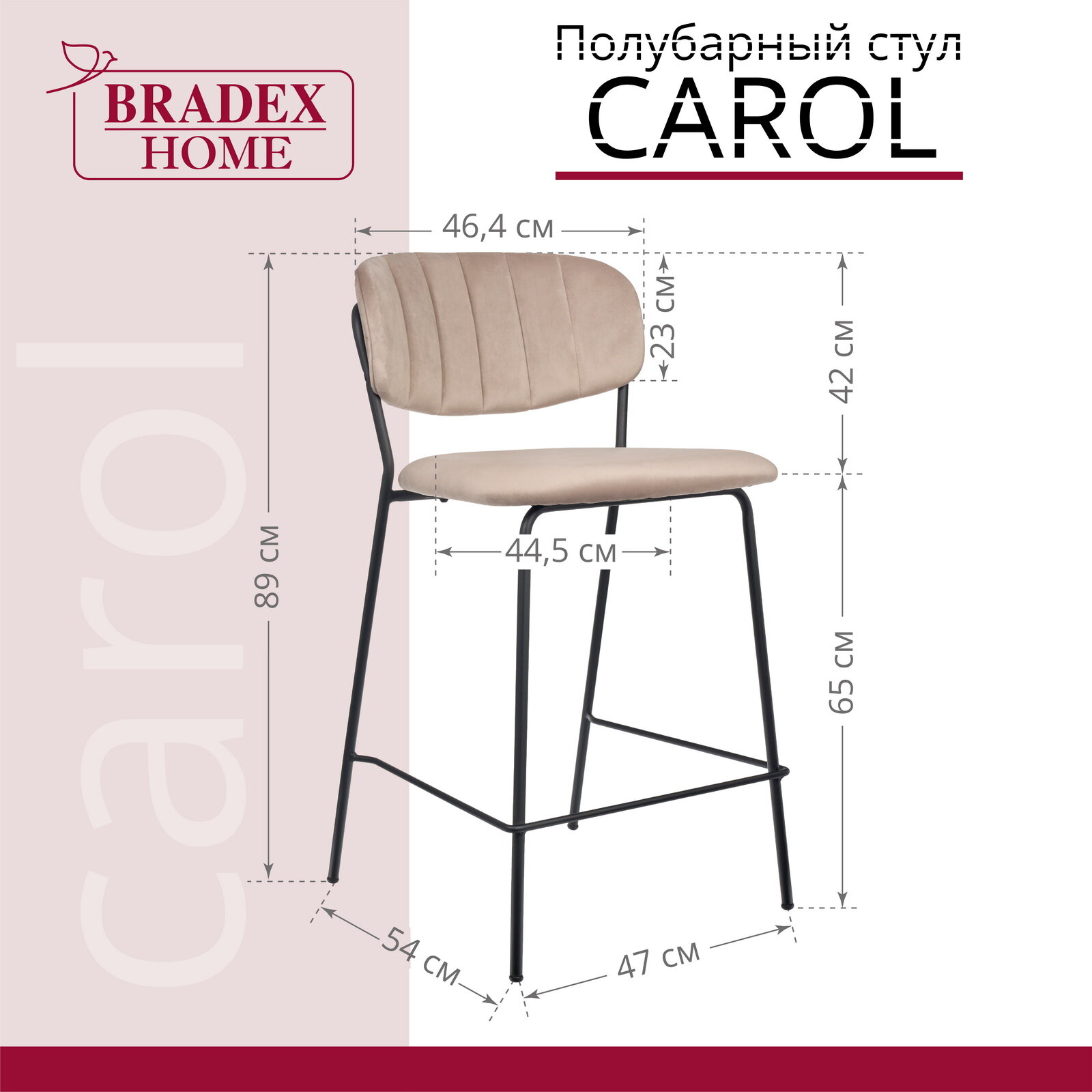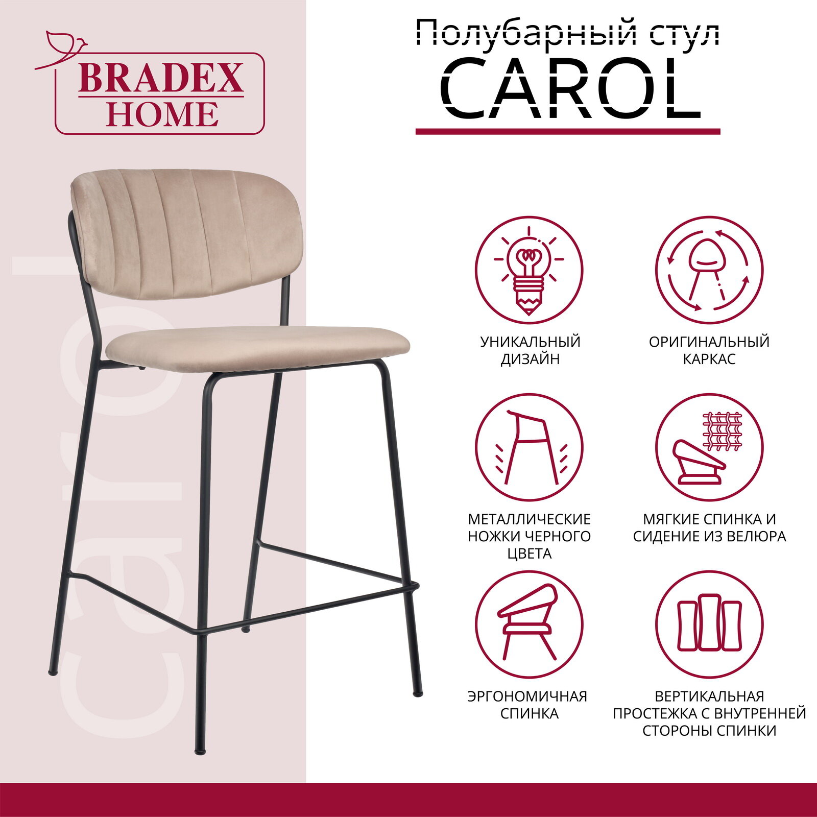 Строгий и лаконичный барный стул CAROL с широким удобным сиденьем и мягкой спинкой, а также высокой комфортной посадкой украсит и кухню в квартире, и интерьер уютного кафе или бара. Крепкий стальной каркас выдерживает вес до 150 кг, что обеспечивает ему высокую степень устойчивости и долговечности. Благодаря утонченному виду стулья кухонные со спинкой украсят интерьер любого домашнего пространства: столовой, кухни, обеденной зоны, около барной стойки. Практичный велюровый материал является неприхотливым и легко чистящимся, не боится влаги и загрязнений, которых не избежать в общих местах отдыха. Поэтому такие дизайнерские стульчики популярны в общественных заведениях: кафе, ресторанах и барах благодаря своему красивому декору и практичности. В линейке CAROL представлены модели в разных цветовых решениях, чтобы вы могли подобрать мебельный комплект к любой интерьерной гамме. В комплект входит инструкция и аксессуары для сборки. Материал: фанера, пенополиуретан, велюр. Материал ножек: сталь. Цвет ножек: черный. Размер стула: 47х54х89х65см. Высота сиденья 65см. Глубина сиденья 45см. Ширина спинки 46,4см. Расстояние между ножек стула 47 и 54см. Вес: 6,1кг. Поставляется в разобранном виде. В комплекте идёт инструкция и комплект аксессуаров для сборки. Барный стул мягкий / Барный стул для дома / Барный стул велюр / Барный стул комфорт / Высокий стул / Барный стул лофт / Мягкий барный стул со спинкой / Стулья для кухни / Стул со спинкой / Кухонные стулья со спинкой / Стулья для гостиной / Лофт мебель / Мягкий стул / Барный стул / Барный табурет