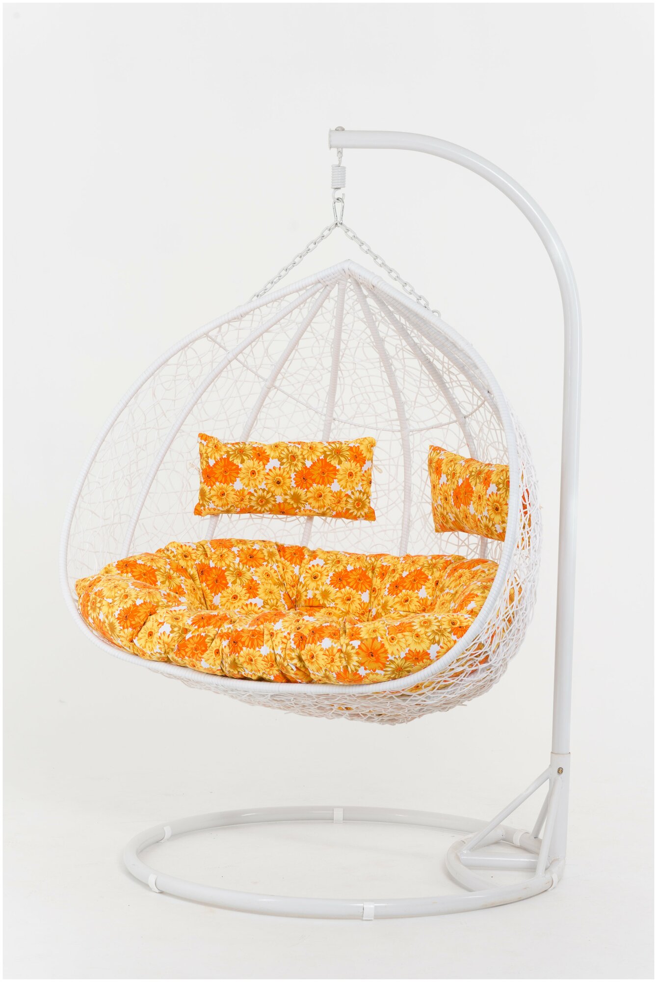 Подвесное кресло 45-004-05 выполнено из высококачественного, плотного искусственного ротанга белого цвета. Кресло имеет в основании прочный стальной каркас, выдерживающий до 200 кг. Вся мебель уникальна, так как сделана вручную квалифицированными специалистами. В солнечных лучах плетение приобретает более светлый и яркий оттенок. Подходит для использования внутри помещения и на открытом воздухе.Материал подушек саржа, наполнитель синтепон. Размеры: глубина - 85см, высота - 201см, ширина - 130см.
