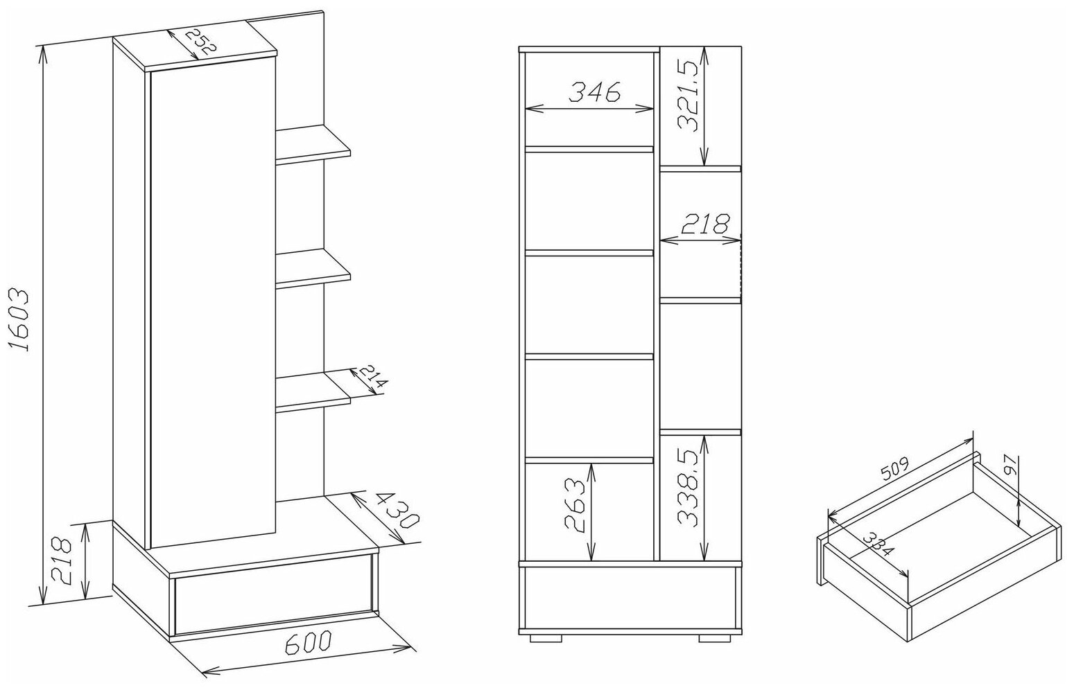 Преимущества:вместительный — множество полочек и отделений для хранения;металлические ручки — стильные и долговечные;функциональный — закрытое отделение для канцелярии и книг, открытое — для декора;шариковые направляющие полного выдвижения — бесшумное выдвижение ящика, долговечность конструкции.Система хранения в этой модели представлена в виде закрытого отделения с 4 полками, образующими 5 ниш, выдвижного ящика на шариковых направляющих, а также открытой части, состоящей из 4 полок. Такое решение позволяет размещать на стеллаже не только книги или папки, но и различные элементы декора.Стильные и актуальные сочетания цветов фасада и корпуса дополнены длинными металлическими ручками, которые делают внешний вид модели еще более современным.Стеллаж собирается только так, как представлено на фото, не универсален.
