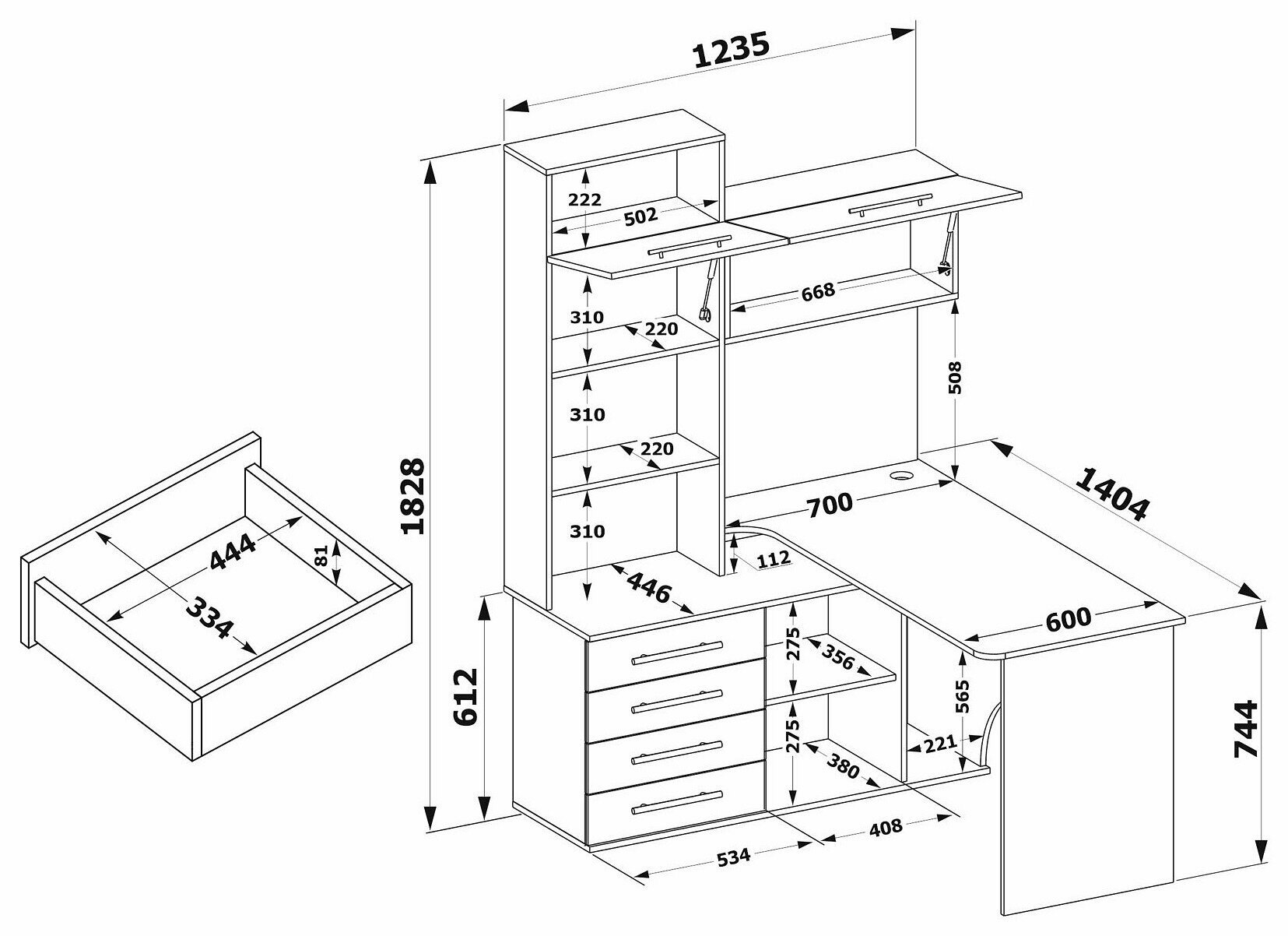 Дополнительные параметры: внутренний размер ящиков - 456х346 мм, задняя стенка сделана из ДВП серого цвета, ручки выполнены из металла, двери шкафчиков открываются вверх, на столешнице имеется отверстие под провода, в комплект входит заглушка, поставляется в разобранном виде,