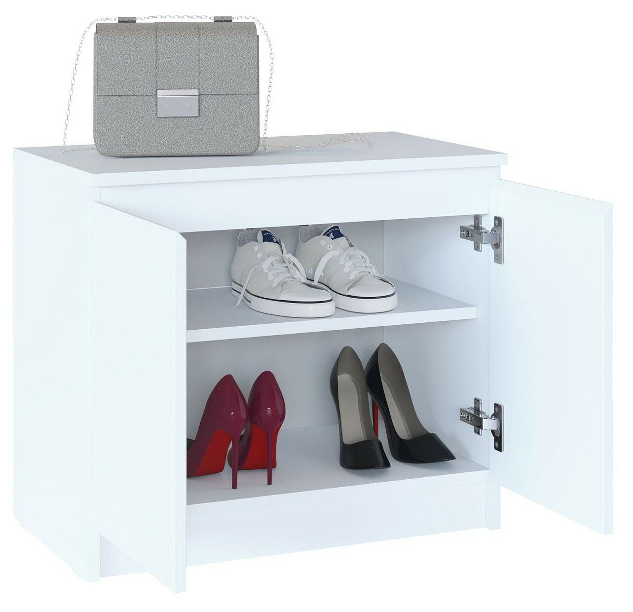 Художественное описание товара: Небольшая, но вместительная тумба для обуви. Данная модель позволяет разместить от 4 до 6 пар низкой обуви, а при необходимости размещения высокой обуви достаточно убрать внутреннюю полку. Фасады без ручек и спил под 45 градусов обеспечивают удобное открывание.,