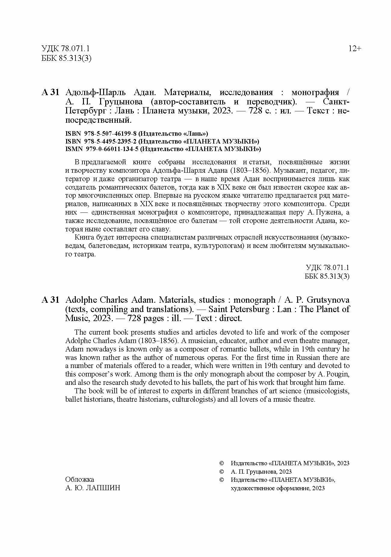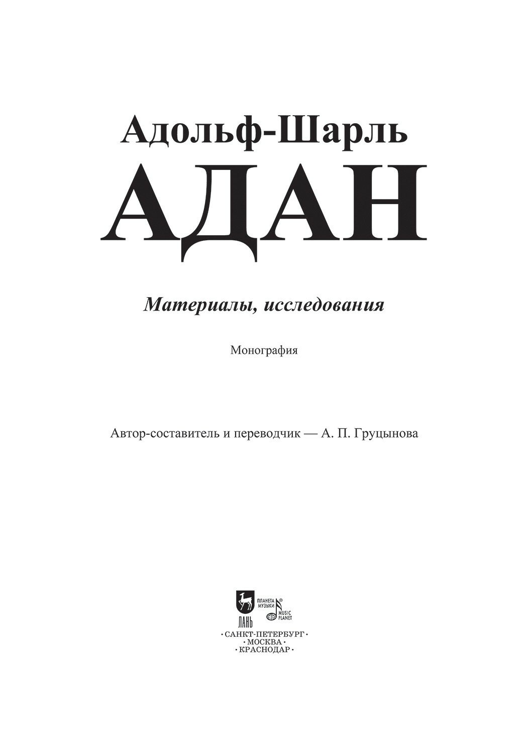 Адольф-Шарль Адан. Материалы исследования. Монография (А. П. Груцынова); Издательство «Планета музыки», 2023