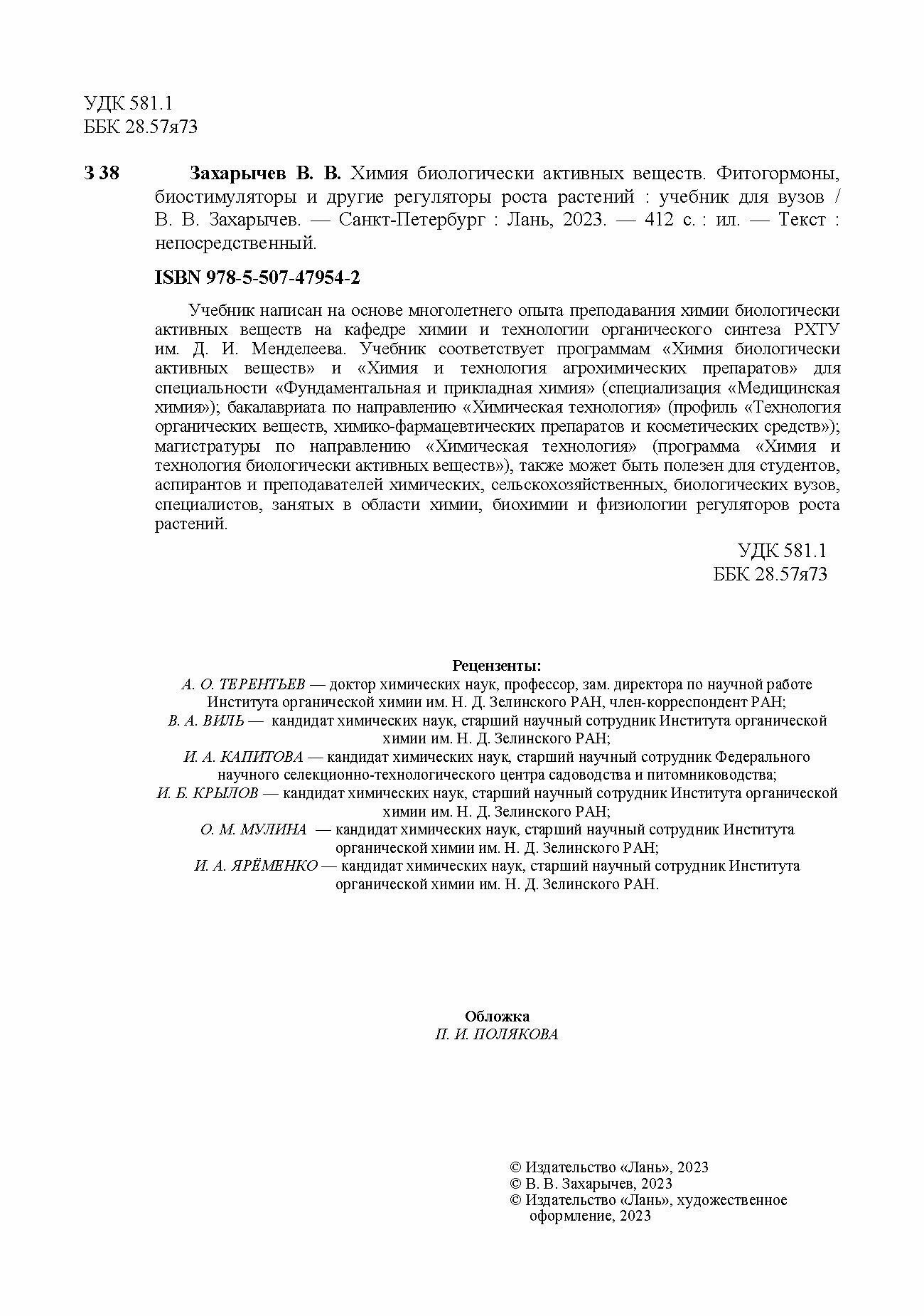 Химия биологически активных веществ. Фитогормоны биостимуляторы и другие регуляторы роста растений (Захарычев Владимир Владимирович); Лань, 2023