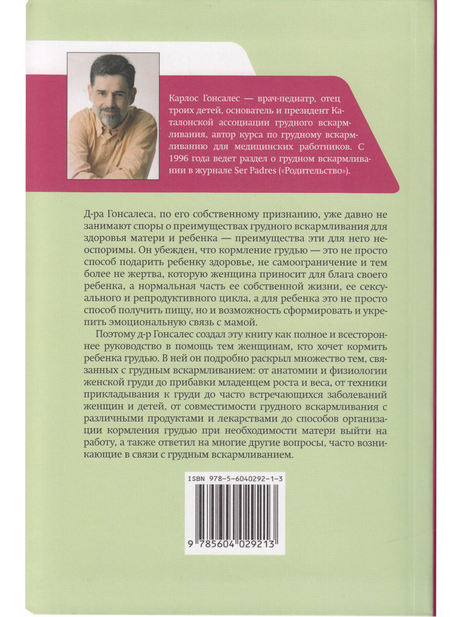 Скорее всего, споры о преимуществах грудного вскармливания для здоровья матери и ребенка для вас не актуальны, потому что преимущества эти неоспоримы. Автор этой книги д-р Гонсалес убежден, что кормить ребенка грудью - это не просто способ подарить ему здоровье, не самоограничение и тем более не жертва, которую женщина приносит для блага своего ребенка, а нормальная часть ее собственной жизни, ее сексуального и репродуктивного цикла. А для ребенка это не просто способ получить пищу, но и возможность сформировать и укрепить эмоциональную связь с мамой. Поэтому д-р Гонсалес создал эту книгу как полное и всестороннее руководство в помощь тем женщинам, кто ищет ответ на вопрос как кормить ребенка грудью. Книга д-ра Гонсалеса не только подробно расскажет как кормить ребенка, но и очень доходчиво обоснует, почему это нужно делать именно так. Книга носит подзаголовок "Руководство по грудному вскармливанию", и это очень важно: в книге говорится не только и не столько о пользе ГВ, сколько даются ответы, пожалуй, на все насущные практические вопросы о том, как кормить ребенка грудью (вы можете убедиться в этом, ознакомившись с оглавлением книги). Автор подробно раскрыл множество тем, связанных с грудным вскармливанием: от анатомии и физиологии женской груди до прибавки младенцем роста и веса, от техники прикладывания к груди до часто встречающихся заболеваний женщин и детей, от совместимости грудного вскармливания с различными продуктами и лекарствами до способов организации кормления грудью при необходимости матери выйти на работу, а также ответил на многие другие вопросы, часто возникающие в связи с темой как кормить ребенка. Об авторе Карлос Гонсалес (родился в Сарагосе в 1960 году) - врач-педиатр и автор нескольких книг о питании, воспитании и здоровье детей. Женат, является отцом троих сыновей. Д-р Гонсалес получил высшее образование в Автономном университете Барселоны, прошел подготовку в качестве педиатра в больнице Сан Хуан де Деу в Барселоне, затем в качестве специалиста по лактации в Лондонском университете. Карлос Гонсалес является основателем и президентом Каталонский ассоциации грудного вскармливания, сотрудничает с различными организациями, занимающимися поддержкой грудного вскармливания. Доктор разработал и долгое время вел курс по грудному вскармливанию для медицинских работников и консультантов. Также Карлос Гонсалес перевел на испанский язык несколько книг по грудному вскармливанию, более двадцати лет ведет колонку на эту тему в журнале Ser Padres ("Родительство"). Он считается одним из самых активных пропагандистов теории привязанности в испаноязычных странах. Книги Карлоса Гонсалеса охватывают все насущные вопросы первых лет жизни малышей - от питания до воспитания. 2-е издание.