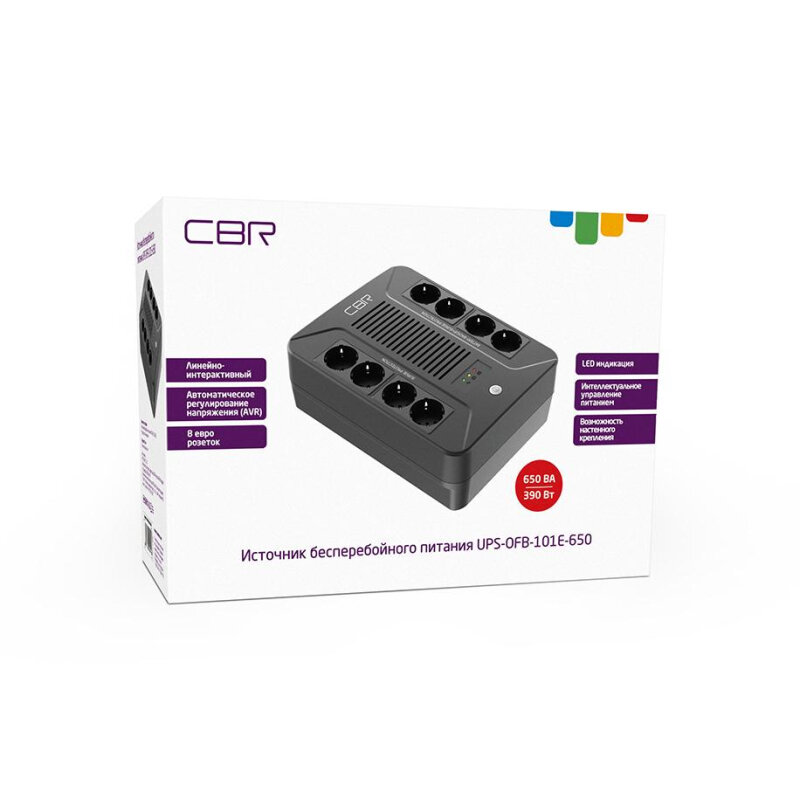Источник бесперебойного питания CBR 650VA/390W Schuko CEE 7 Outlets: (x4 Battery & Surge Protected; x4 Surge Protected) LED AVR S UPS-OFB-101E-650