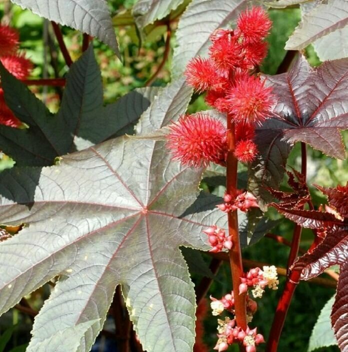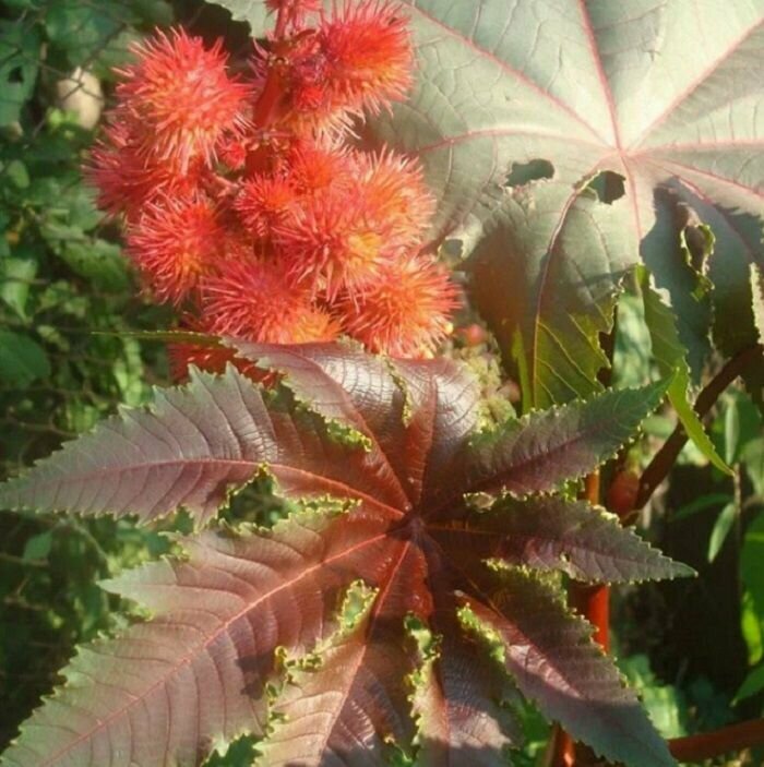 Декоративное растение из семейства Молочайные высотой 1,2 м. Растение мощное, быстрорастущее, достигающее исполинских размеров. Стебли прямостоячие, разветвленные. Листья зеленые, бронзовые с красным оттенком, пальчато-раздельные, с 5-10 лопастями. Цветки ярко-красные, собраны в плотные кистевидные соцветия. Теплолюбива, светолюбива и довольно засухоустойчива, предпочитает участки с плодородной и хорошо обработанной почвой. Выращивается рассадным способом. Посев проводят в начале апреля в горшочки по 2-3 шт. Всходы появляются через 10-12 дней. Рассаду высаживают в открытый грунт в начале июня на расстоянии 60-80 см. Используется в оформлении участка.