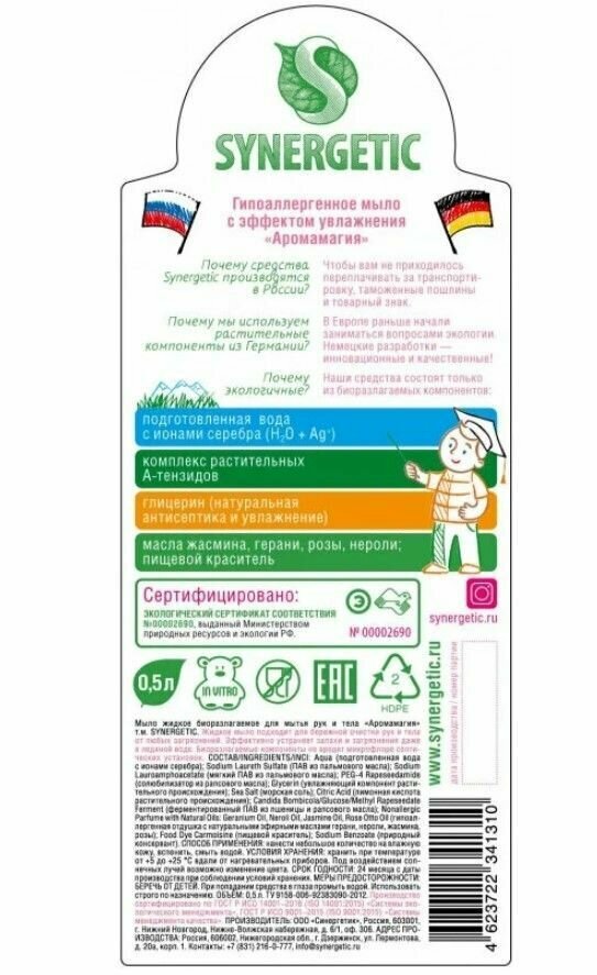 Биоразлагаемое жидкое мыло SYNERGETIC «Аромамагия» подходит для бережной очистки рук и тела от любых загрязнений. Мягкие биоразлагаемые тензиды, полученные из растительных масел, превосходно удаляют загрязнения кожи, не вызывая ее раздражения. Натуральный растительный глицерин в составе мыла защищает кожу от сухости и обеспечивает антисептический эффект, благодаря антибактериальной активности. Мультифункциональный компонент софоролипид заботится о микробиоме кожи. Гипоаллергенная отдушка на основе эфирных масел герани, нероли, жасмина, розы придаёт средству приятный цветочный аромат, который подходит даже для людей с чувствительной кожей. Пищевой краситель в низких концентрациях придаёт средству нежный розовый оттенок.
