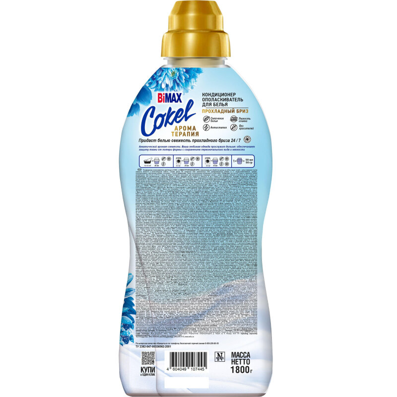Кондиционер для белья Cokel BiMax Прохладный бриз 1.8 л. Назначение: Акватический аромат свежести. Ваша любимая одежда прослужит вам еще дольше: обеспечивает защиту ткани от потери формы, чтобы одежда дольше сохраняла первоначальный вид и мягкость. Придаст белью свежесть прохладного бриза 24/7; Смягчение белья; Антистатик; Легкость глажки; Без красителей. Способ применения: Перед использованием рекомендуется взбалтывать. Дозировки: для ручной стирки и стиральных машин активаторного типа 20 мл в (10-15) л воды во время последнего полоскания; для автоматических стиральных машин с целью придания свежести и мягкости 25 мл в кювету для кондиционера; для автоматических стиральных машин с целью придания экстра свежести и мягкости 35 мл в кювету для кондиционера. Меры предосторожности: При попадании средства на слизистые оболочки и в глаза необходимо промыть их проточной водой. Состав: менее 5%: катионные ПАВ: неионогенные ПАВ, ароматизирующая добавка (в т. ч. альфа-изометилионон, кумарин, гексилциннамаль), умягчающая