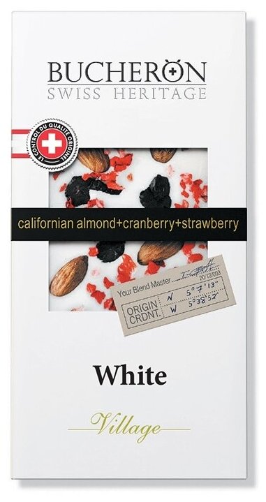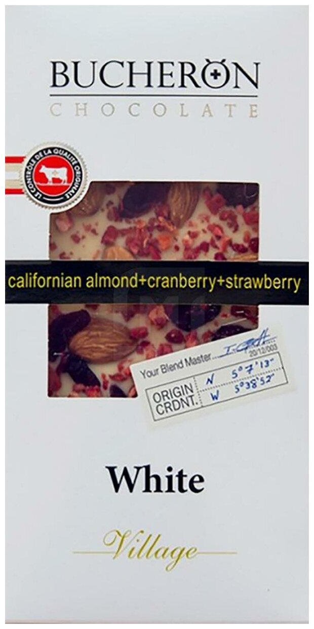 BUCHERON белый шоколад с миндалем,клюквой и клубникой в картоне 100г. Это изысканный и нежный десерт, который станет настоящим наслаждением для ценителей тонких вкусов.