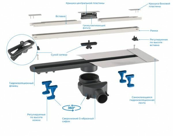 | Комплектация | грязеуловитель; душевой желоб; душевой лоток; защитная заглушка; инструкция; набор креплений; опоры; прокладка гидроизолирующая; решетка; сифон; стакан для сифона |