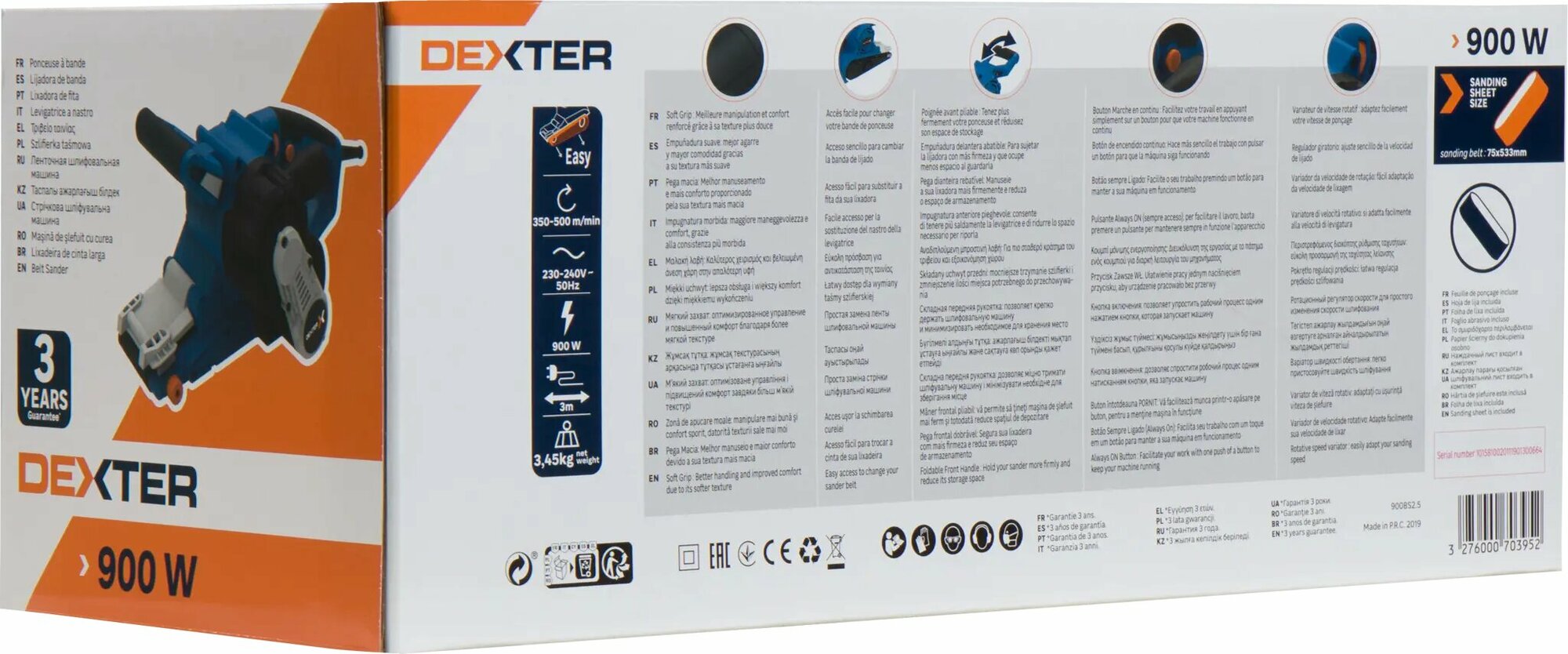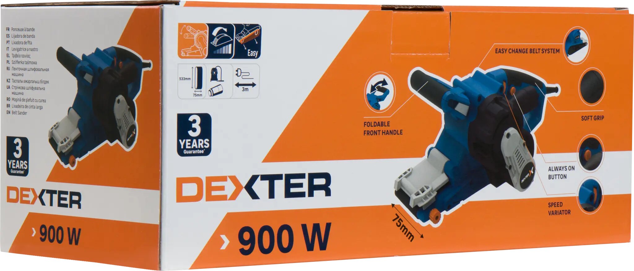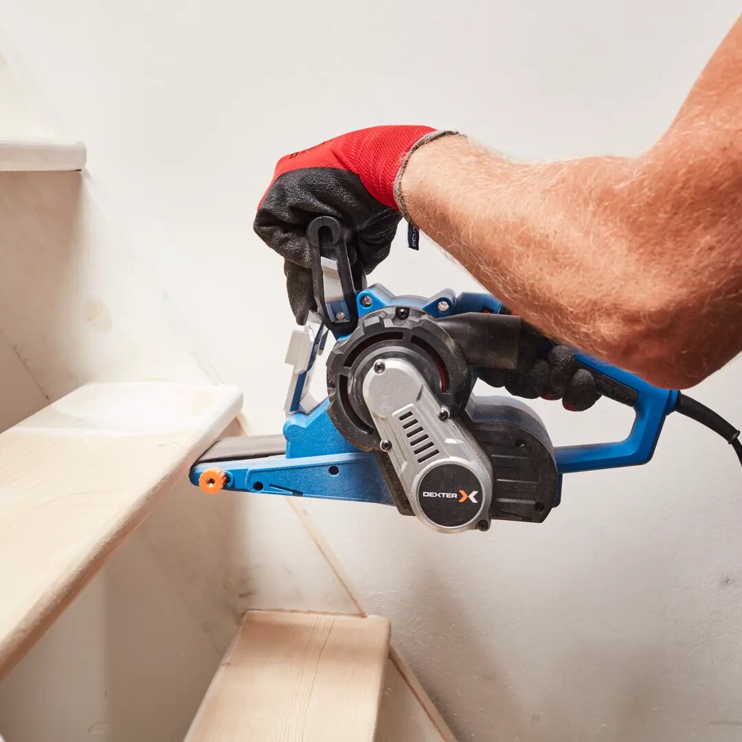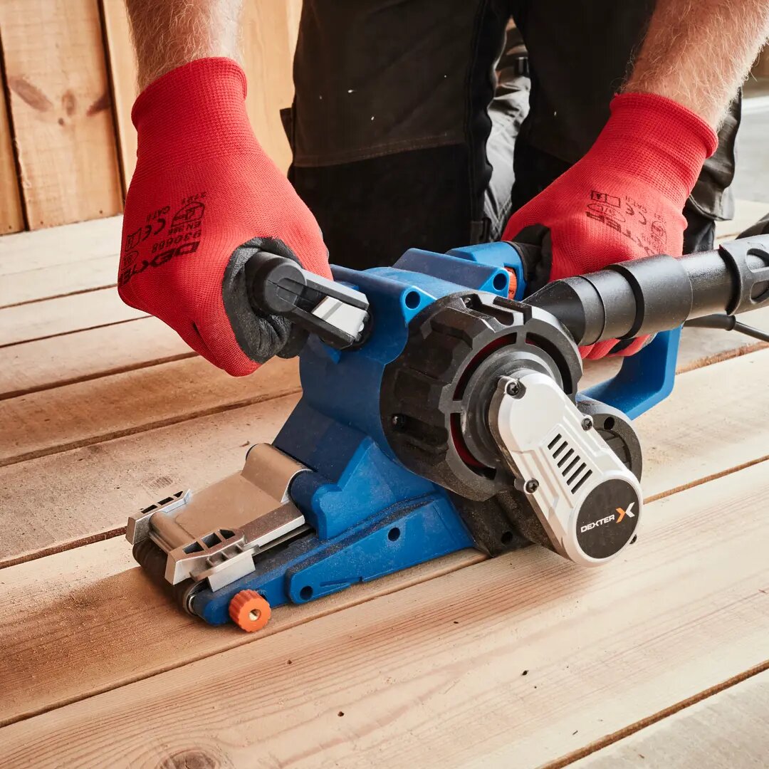 **Ленточная шлифмашина сетевая Dexter 900BS2.52** — многоцелевой электроинструмент мощностью 900 Вт, который используется для шлифовки поверхностей из твердых материалов. Рабочая часть представлена в виде непрерывной ленты из абразивного материала. Полотно натянуто на специальные подвижные ролики — оно совершает однонаправленные движения. Скорость при этом постоянная — можно регулировать ее величину, переключаясь между шестью уровнями. Удобная эргономичная рукоятка с прорезиненными накладками обеспечивает улучшенный хват и противостоит соскальзыванию инструмента. Поддерживается возможность подключения пылесоса (предусмотрен патрубок) — для поддержания рабочей поверхности в чистом состоянии. Инструмент работает от стандартной бытовой сети. Для подключения к ней используется 3-метровый кабель, обеспечивающий большую свободу действия.