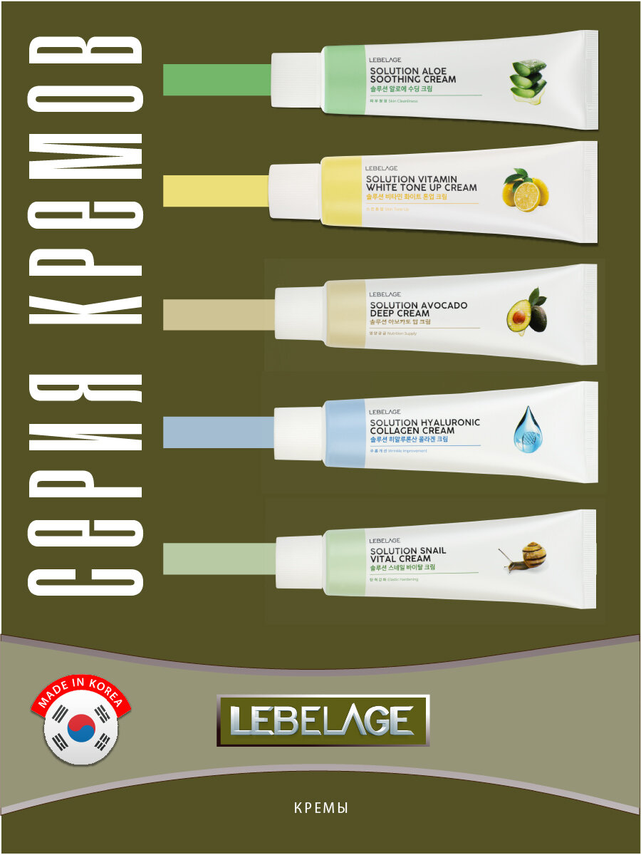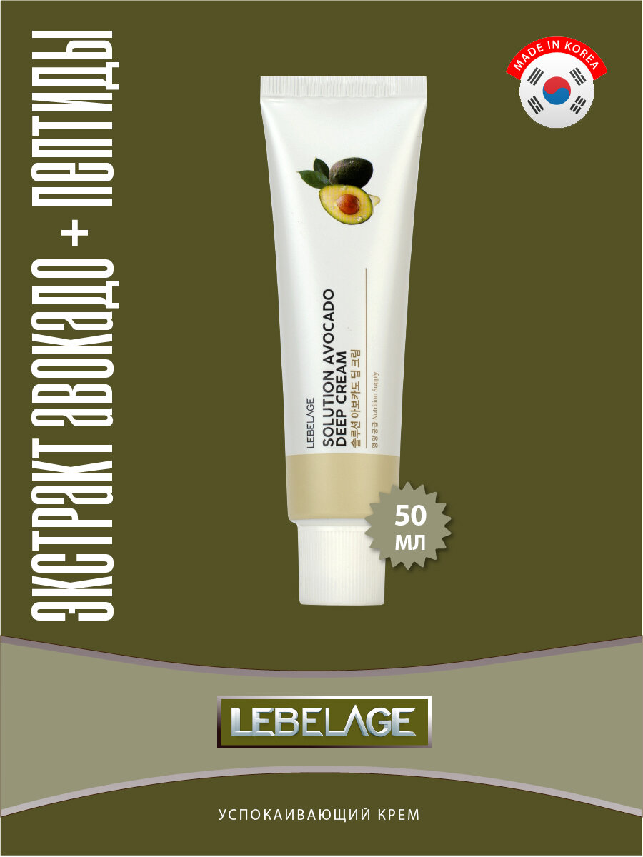 LEBELAGE SOLUTION AVOCADO DEEP CREAM Питательный крем с экстрактом авокадо и пептидами восстанавливает защитный барьер кожи. Экстракт авокадо повышает устойчивость кожи к внешним воздействиям, предотвращает преждевременное старение. Комплекс из 4-х пептидов стимулирует синтез коллагена, укрепляет и подтягивает кожу. Крем впитывается за считанные секунды, не оставляя после себя липкости или ощущения жирности. Способ применения: на предварительно очищенную, тонизированную кожу нанести необходимое количество крема, аккуратно распределить массажными движениями.