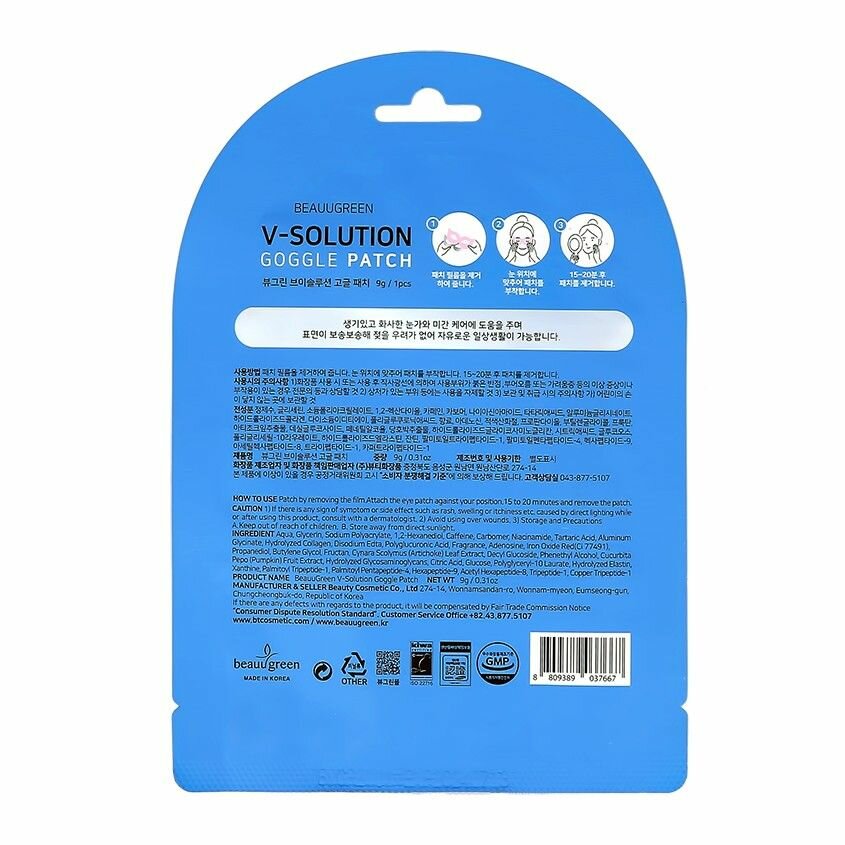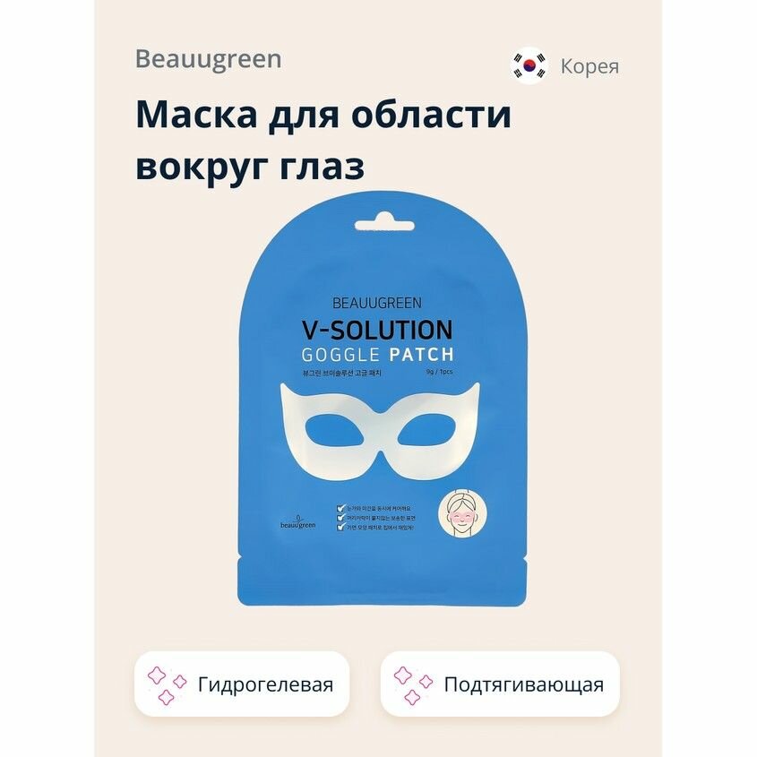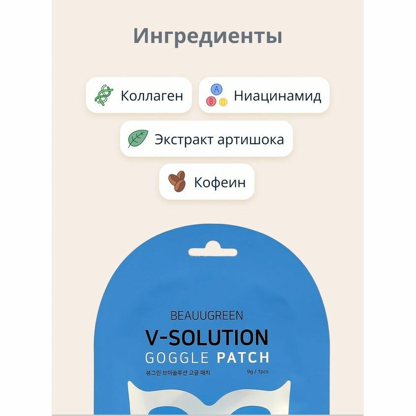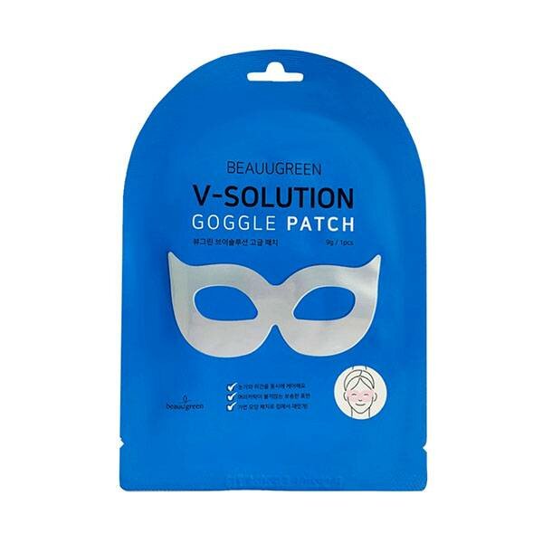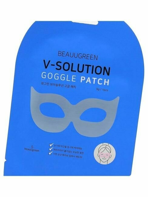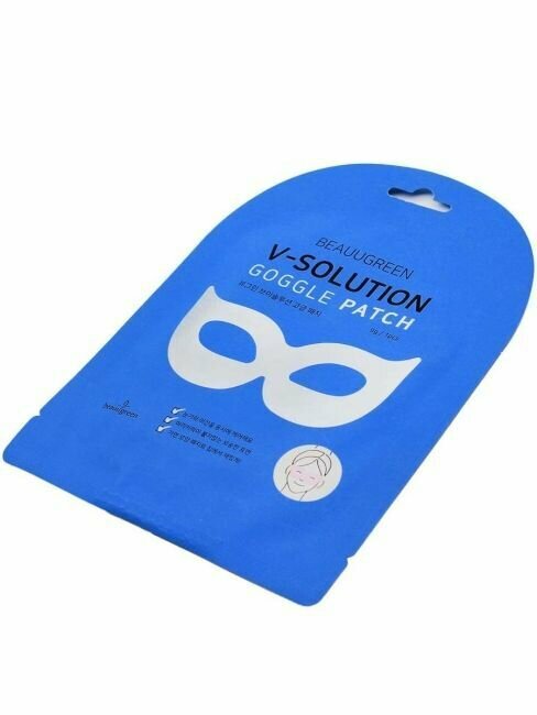 BeauuGreen V-Solution Goggle Patch Гидрогелевая лифтинг-маска для кожи вокруг глаз мгновенно устраняет сухость, восполняет недостаток влаги, избавляет от припухлостей и отёков, оказывает лимфодренажное действие. Содержит кофеин, коллаген, аденозин, ниацинамид и комплекс пептидов. Способ применения: плотно приложите маску к очищенному, увлажнённому лицу. Подождите 15-20 минут и снимите. Дайте впитаться эссенции, мягкими похлопывающими движениями.