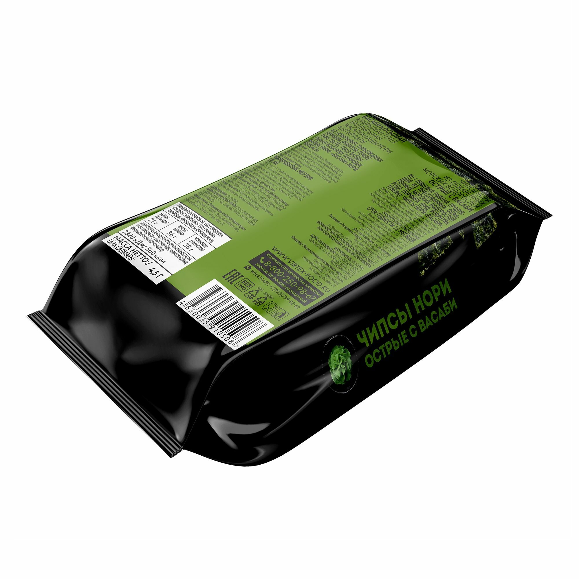 | Состав | Морские водоросли рода Порфира (вид Porphyra tenera), масло кукурузное, масло кунжутное, соль, порошок васаби (горчица, вкусоароматические вещества, мальтодекстрин, масло пальмовое, стабилизатор (декстрины)). |